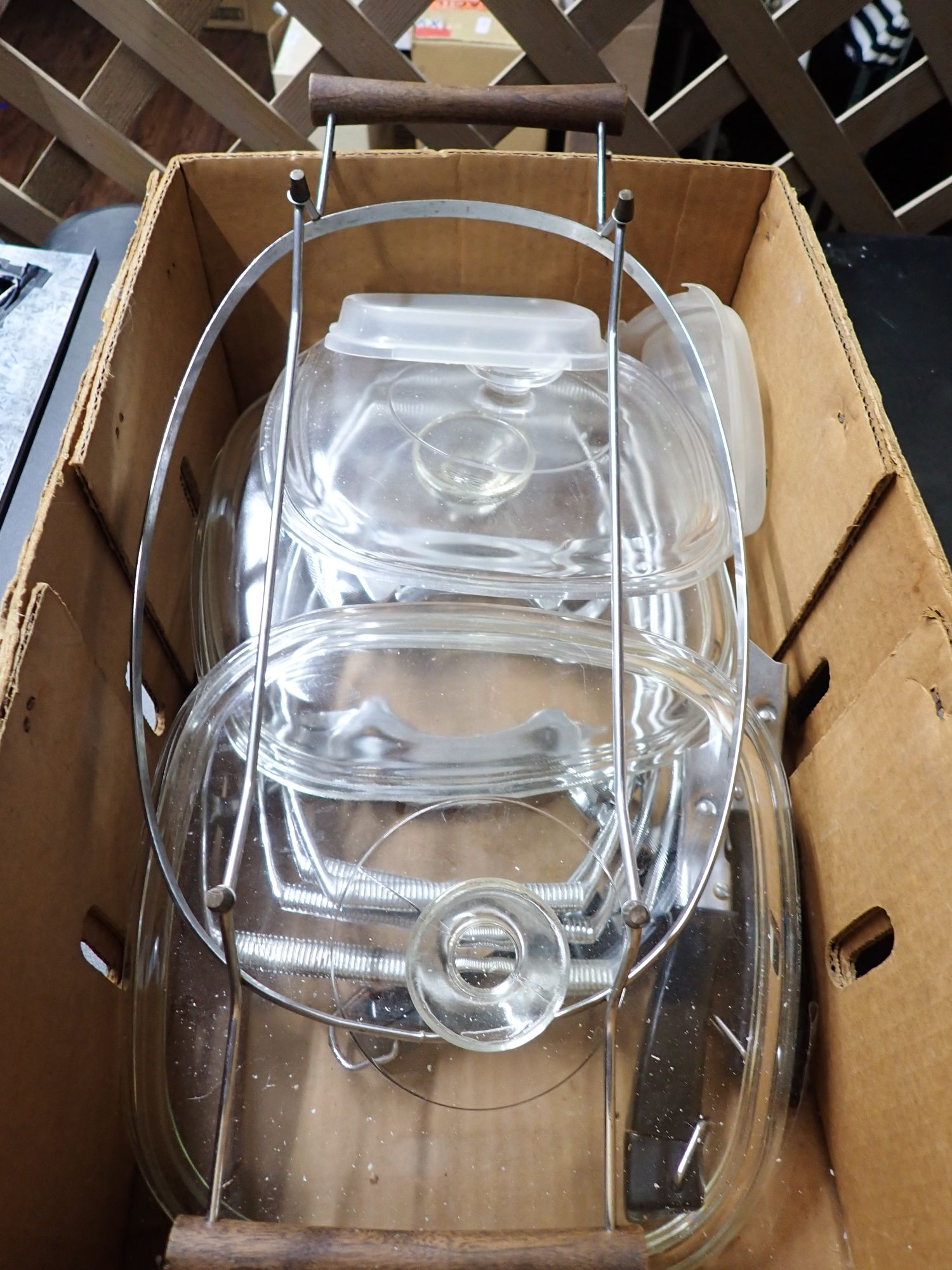 Box Lot of CorningWare Handles, Lids & Casserole Stands
