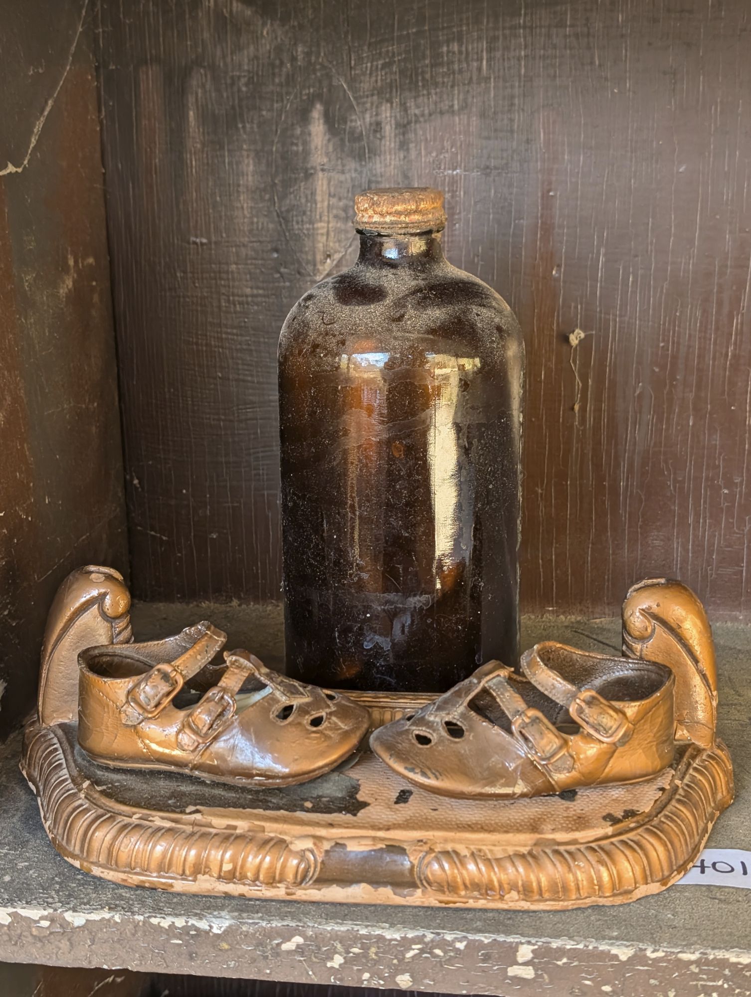 OLD DECORATIVE BABY SHOE DISPLAY AND OLD BOTTLE