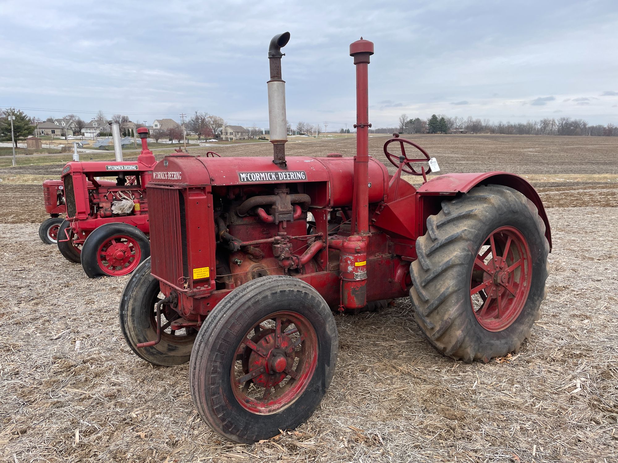 SN #WD11071, Engine appears stuck. fenders and flat spoke rims, MDG 7.50-20SL (R-Front) good, Firestone 7.50-20 (Left front) weather cracking, Goodyear 13-28 (rears- worn), older repaint- flaking, straight sheet metal, some rusting, belt pulley loose.