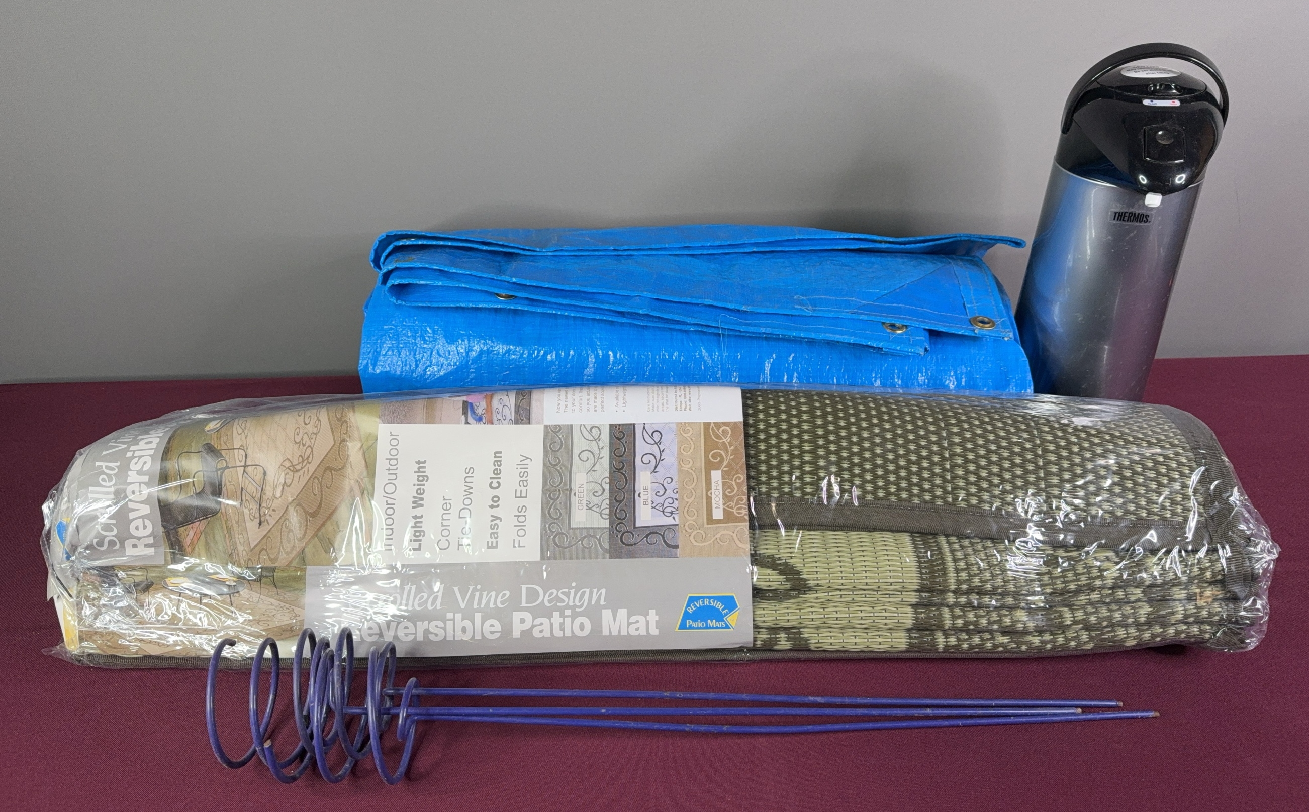 Reversible Camping/Patio Mat, Like New Tarp, & Misc. Outdoor Items