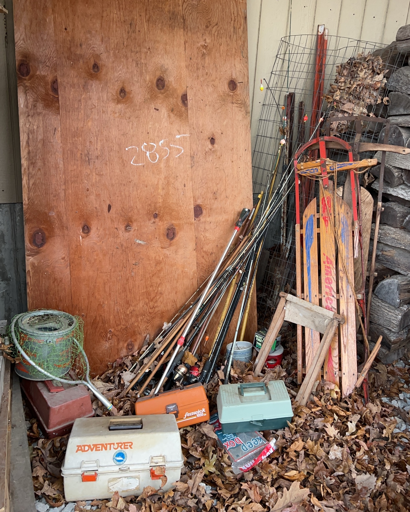 Outdoor equipment includes Stihl F5 55RC Weed Wacker, Husqvarna Chain Saw, multiple log chains (ranging from 12' to 24'), Milwaukee 2-wheel dolly, 28' Werner Extension Ladder, Werner 8' Fiberglass Step Ladder, camping and outdoor gear (tents, hammock, folding chairs, sleeping bags), lawn chairs, croquet sets, garden tools, and massive pile of seasoned split firewood. Additional items include vintage cameras, binoculars, sports magazines, hurricane lamps, quilts, dinnerware sets (Noritake Raleigh, Temp-tations Polka Dot), Pyrex and Fire King bowls, fishing equipment, skis, and propane tanks.