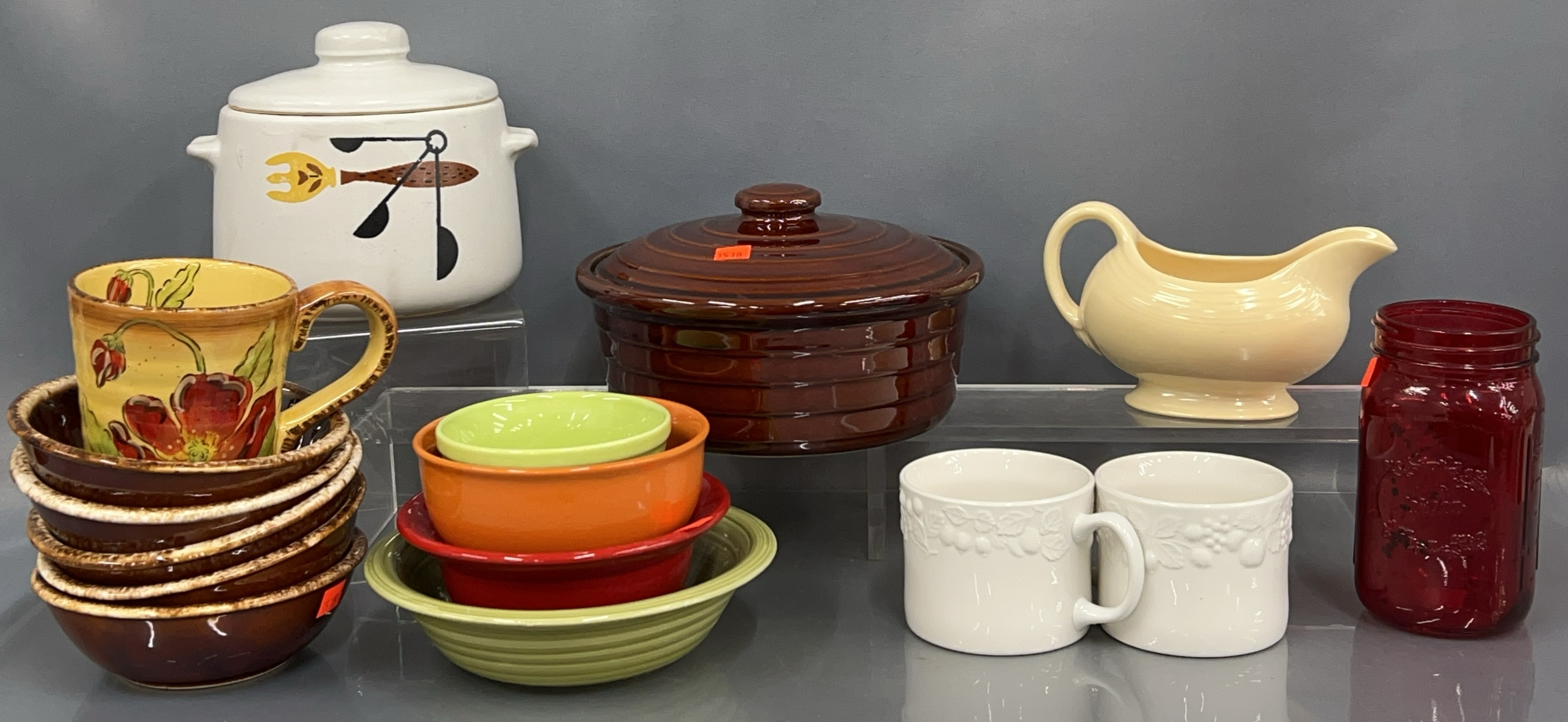 West Bend Bean Pot, Mugs, Fiesta Creamer, Bowls, Mugs, Needs Cleaned