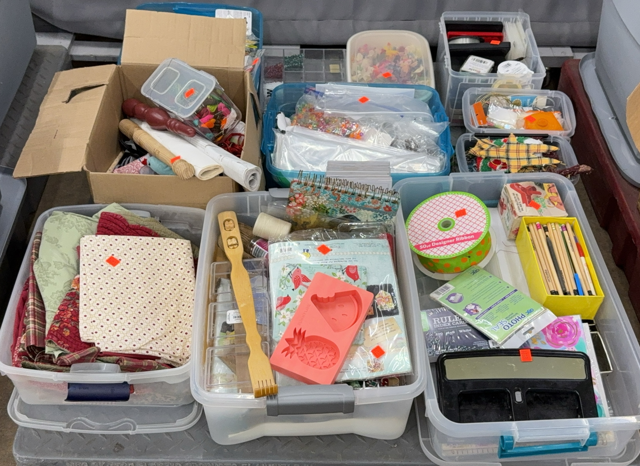 Craft and Quilting Supplies, Small Totes, Hole Punch, Beads, Flowers, Sizzix, Photo Seal, Pencils, Sewing and Some Tapestry Fabrics, SKID NOT INCLUDED