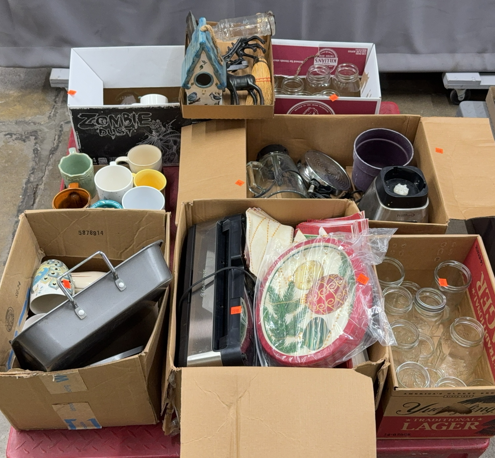 Mason Jars, Mugs, Small Appliances, Paper Holiday Serving Items, Bird House Decor, SKID NOT INCLUDED