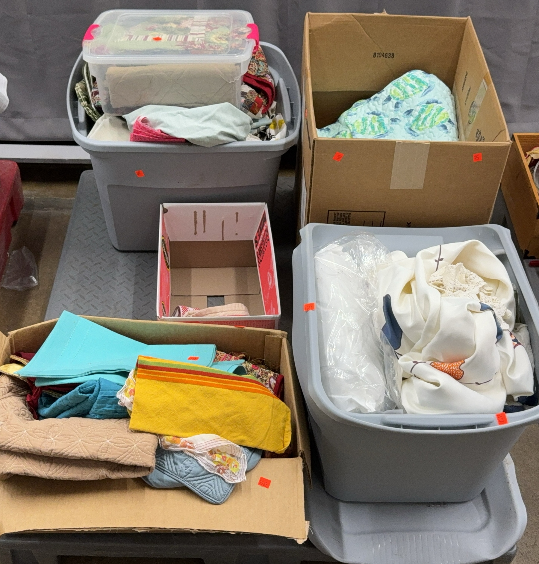 Boxes, Totes, With Kitchen Linens, Bedding, Curtains, Cloth Napkins, SKID NOT INCLUDED