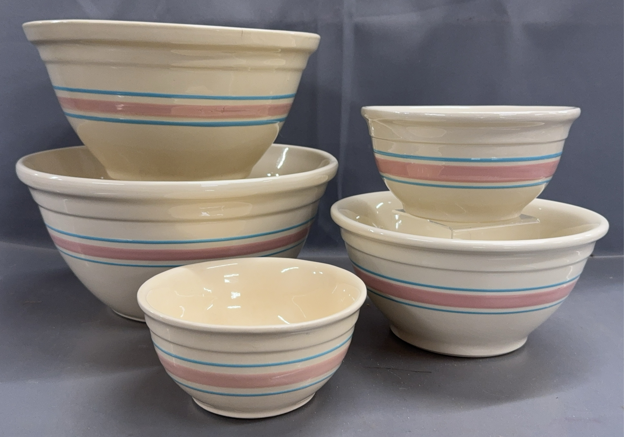 Nelson McCoy Pink & Blue Stripe Large Pottery Mixing Bowl Set - 14" x 7" of largest bowl