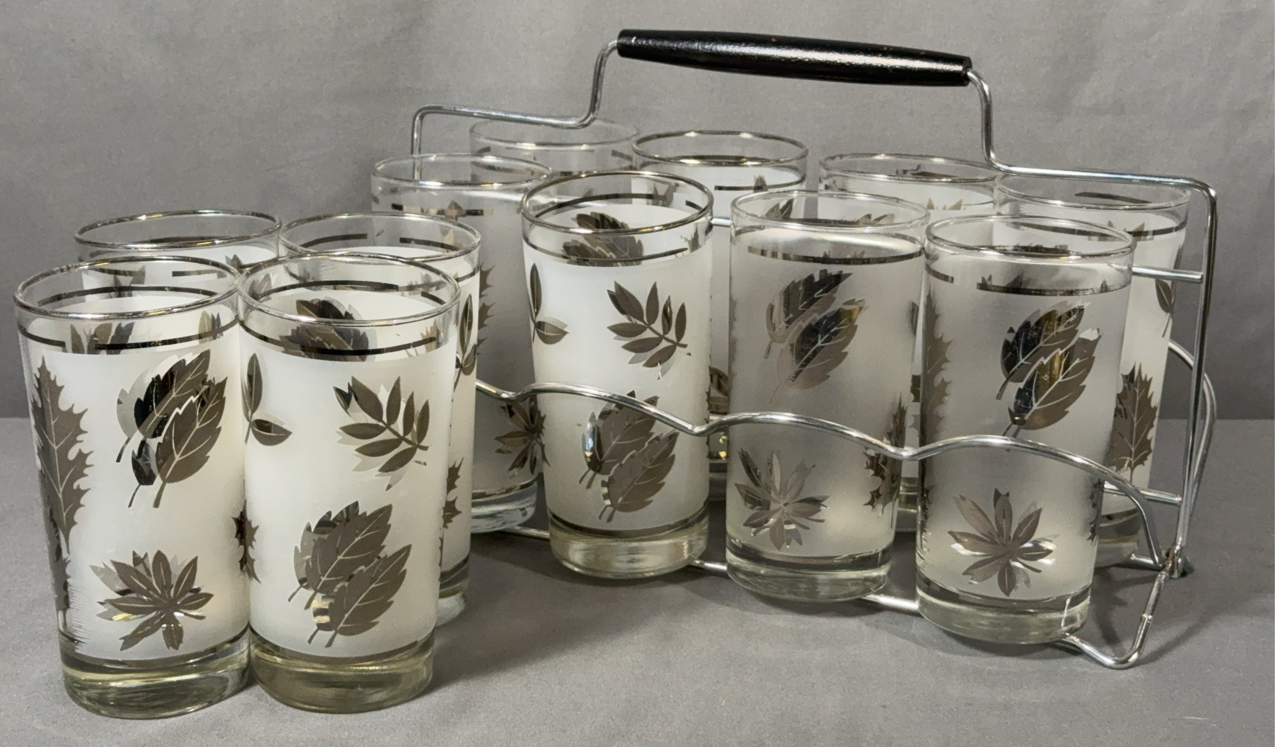 Mid Century Libbey Silver Leaf Glasses and Holder - 5.5" T of each glass - 13" x 8" x 6" of holder - some minor finish loss