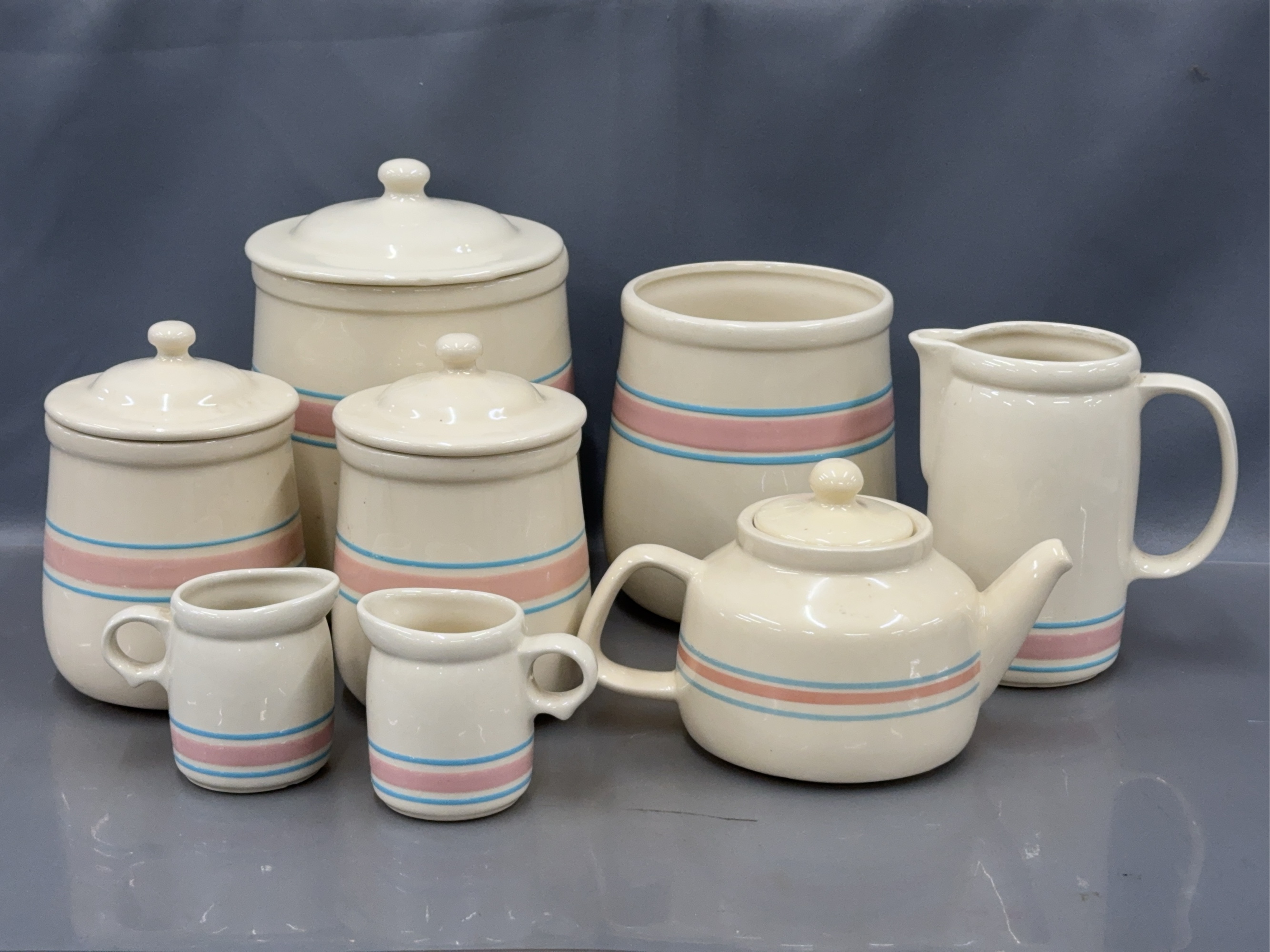 8 Nelson McCoy Pink & Blue Stripe Pottery Canisters, Teapot, Pitcher, Creamers - 9" of tallest