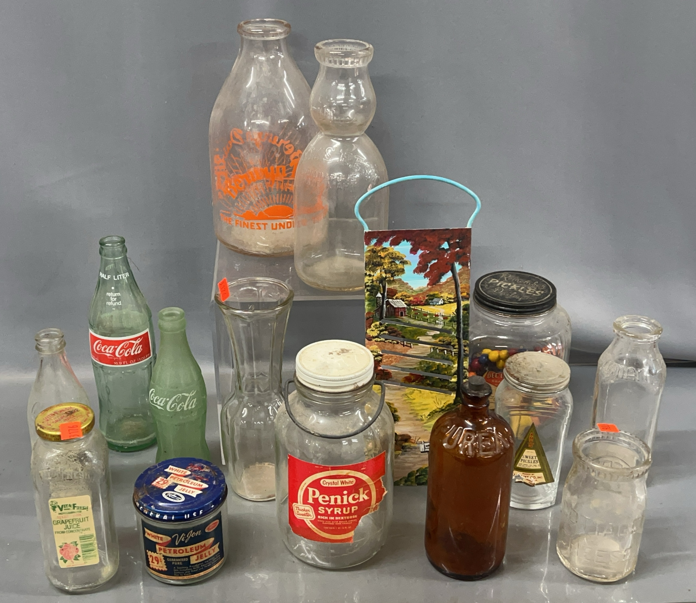 Vintage Glass Milk, Coca Cola, Food Stuff Jars - 9" of tallest - some wear
