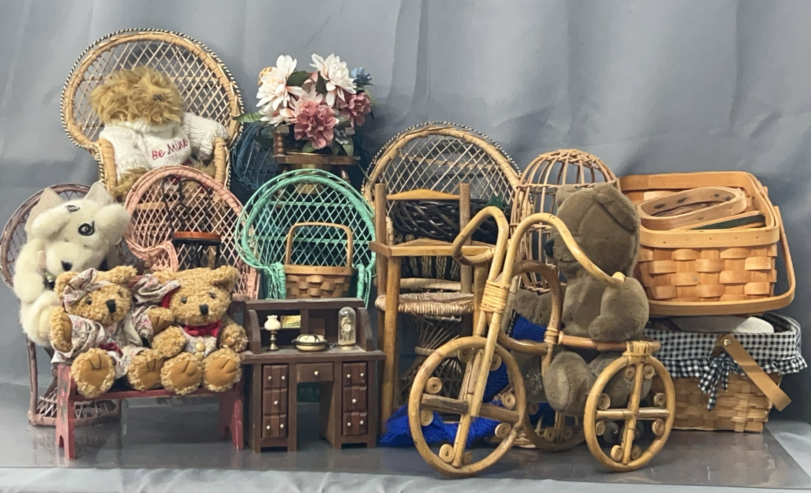 Assorted Baskets and Small Peacock Chairs - Country Woven, Christopher Roberts, and others - 15" of tallest