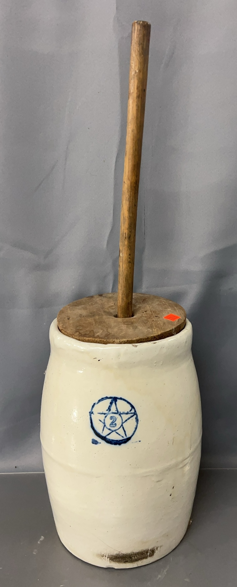 2 Gallon Butter Churn Crock - 27" T overall - visible cracking throughout