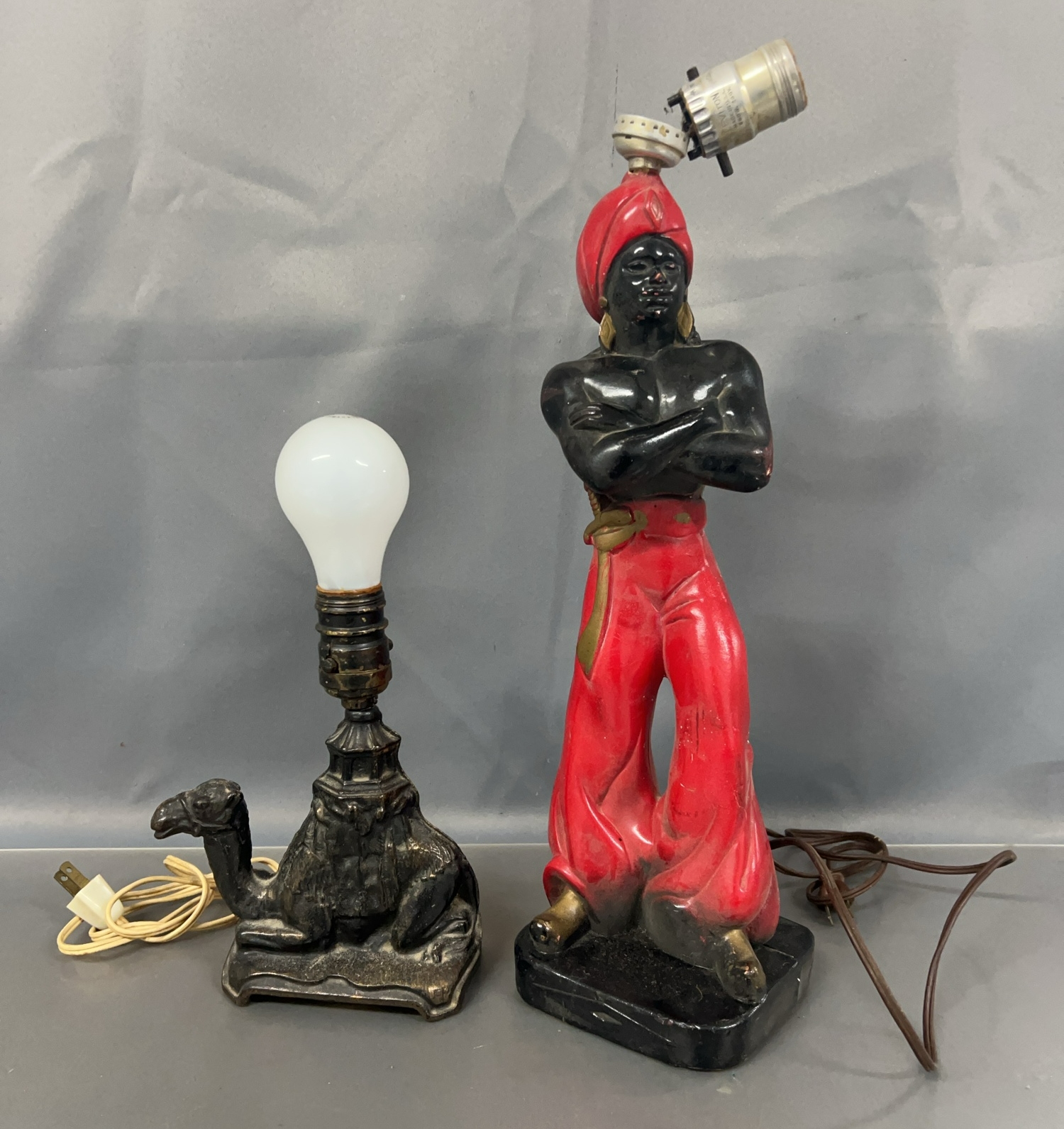 Chalkware Genie and Cast Metal Camel Table Lamps - 17" of tallest - some wear