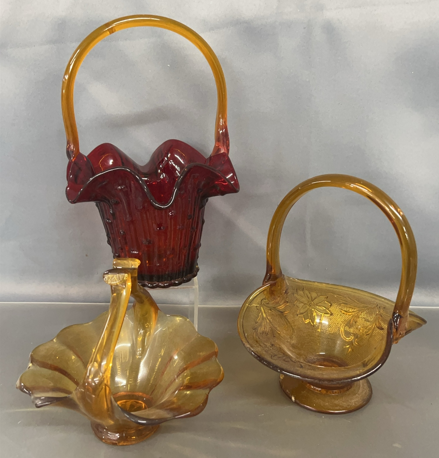 3 Art Glass and Pressed Glass Baskets - 10" of tallest - 1 appears slightly UV reactive