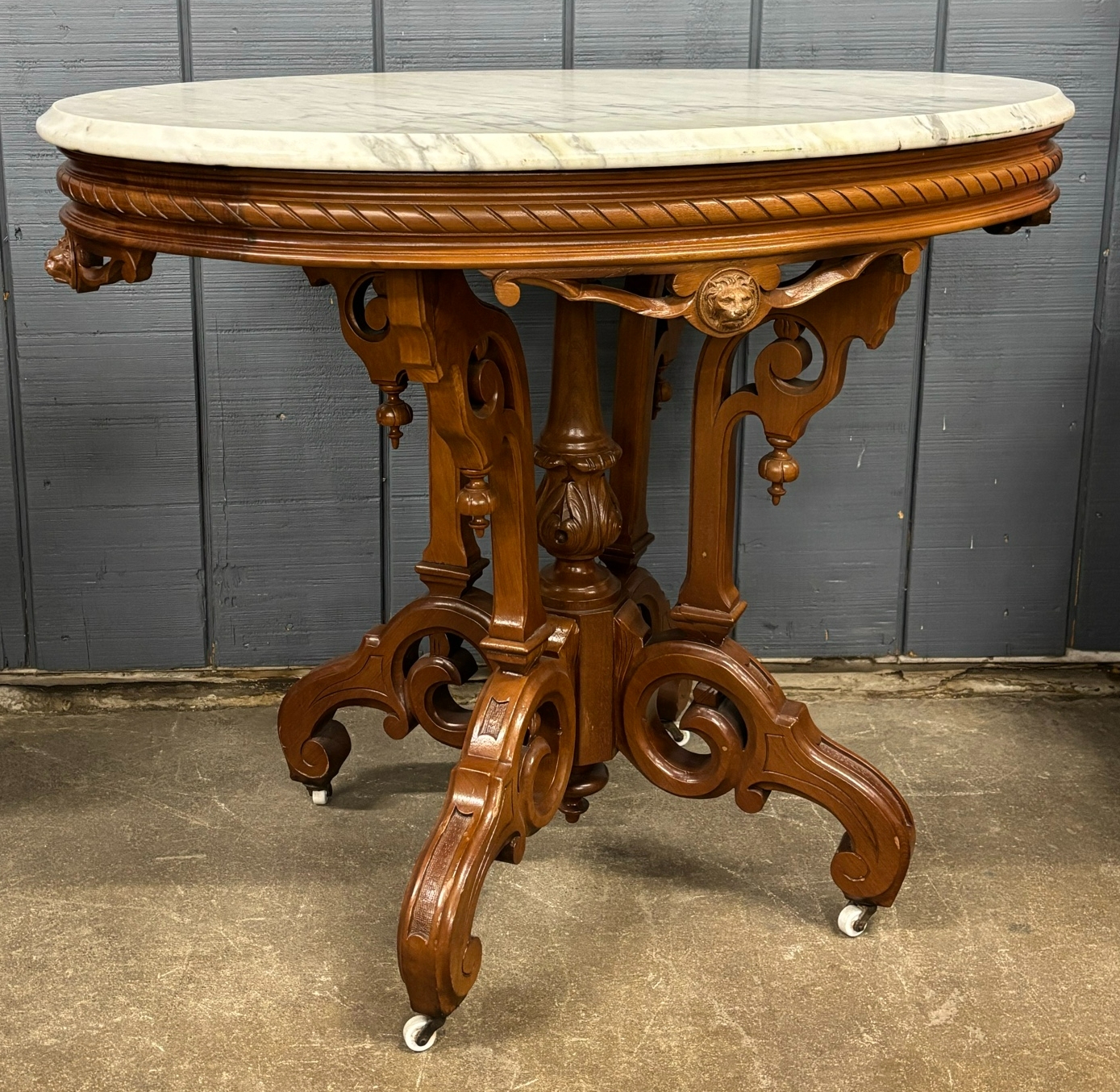 Ornate Lion Crest Carved Wood Marble Top Parlor Table - 34" x 25" x 29"