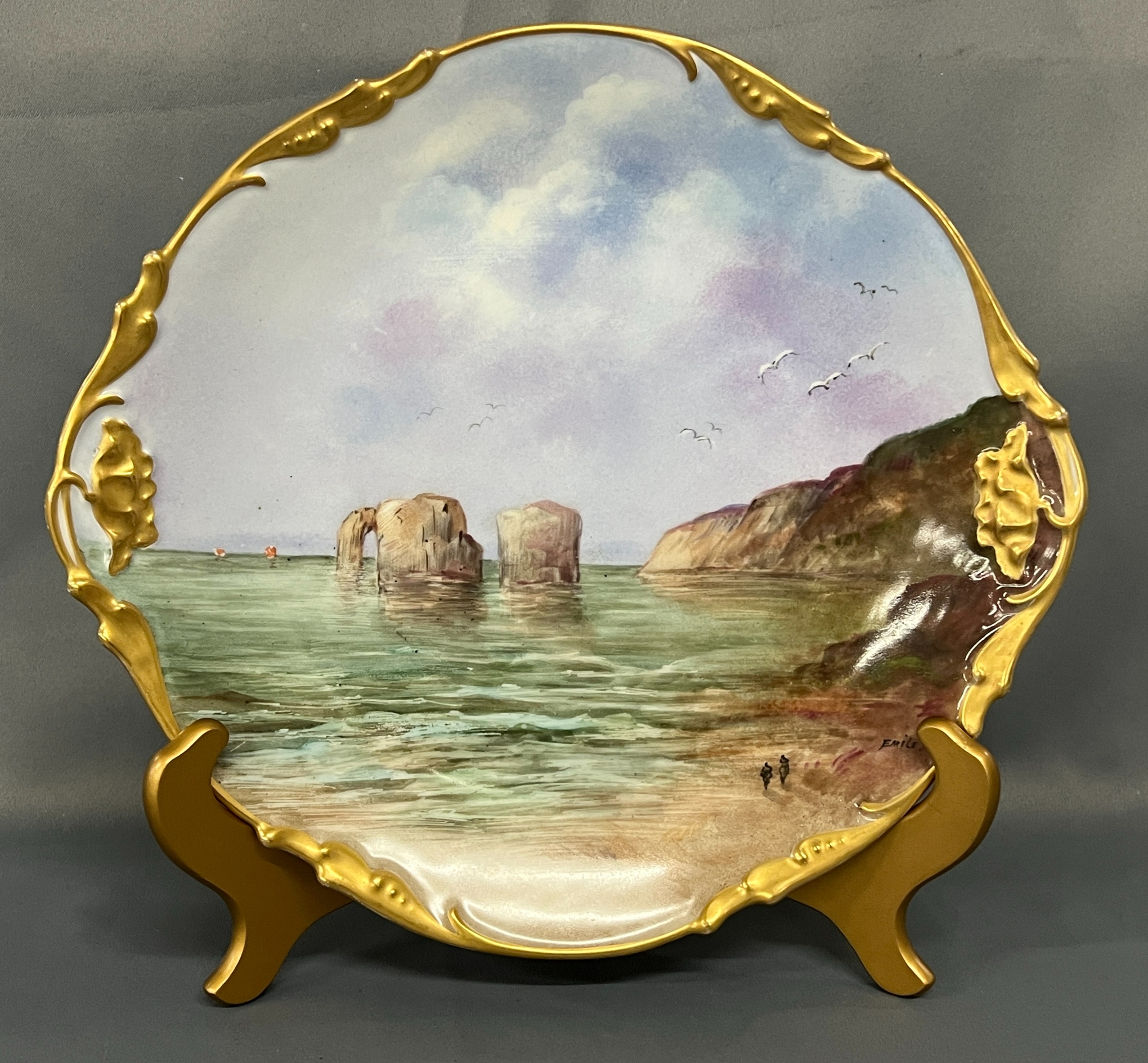 Jean Pouyat Limoges Hand Painted Coastal Landscape Gilt Edge Charger Plate - 12" x 13"