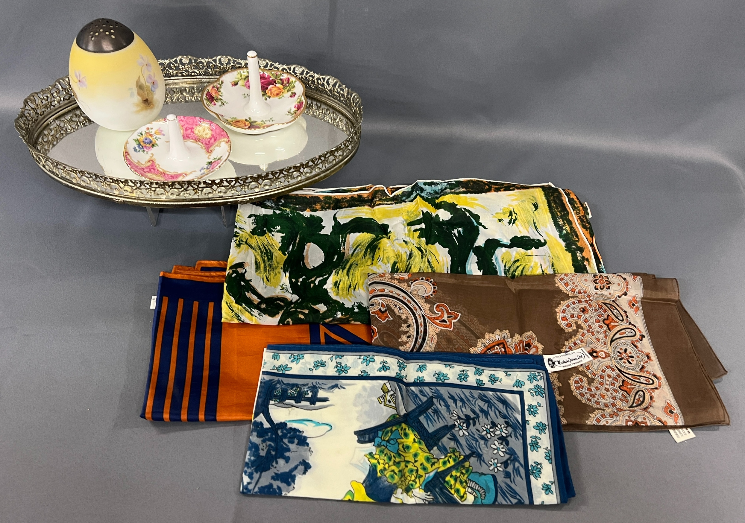Filigree Metal Edge Oval Vanity Mirror, Porcelain Ring Holders, Hand Painted Powder Jar, 4 Ladies Scarves - 13" of mirror