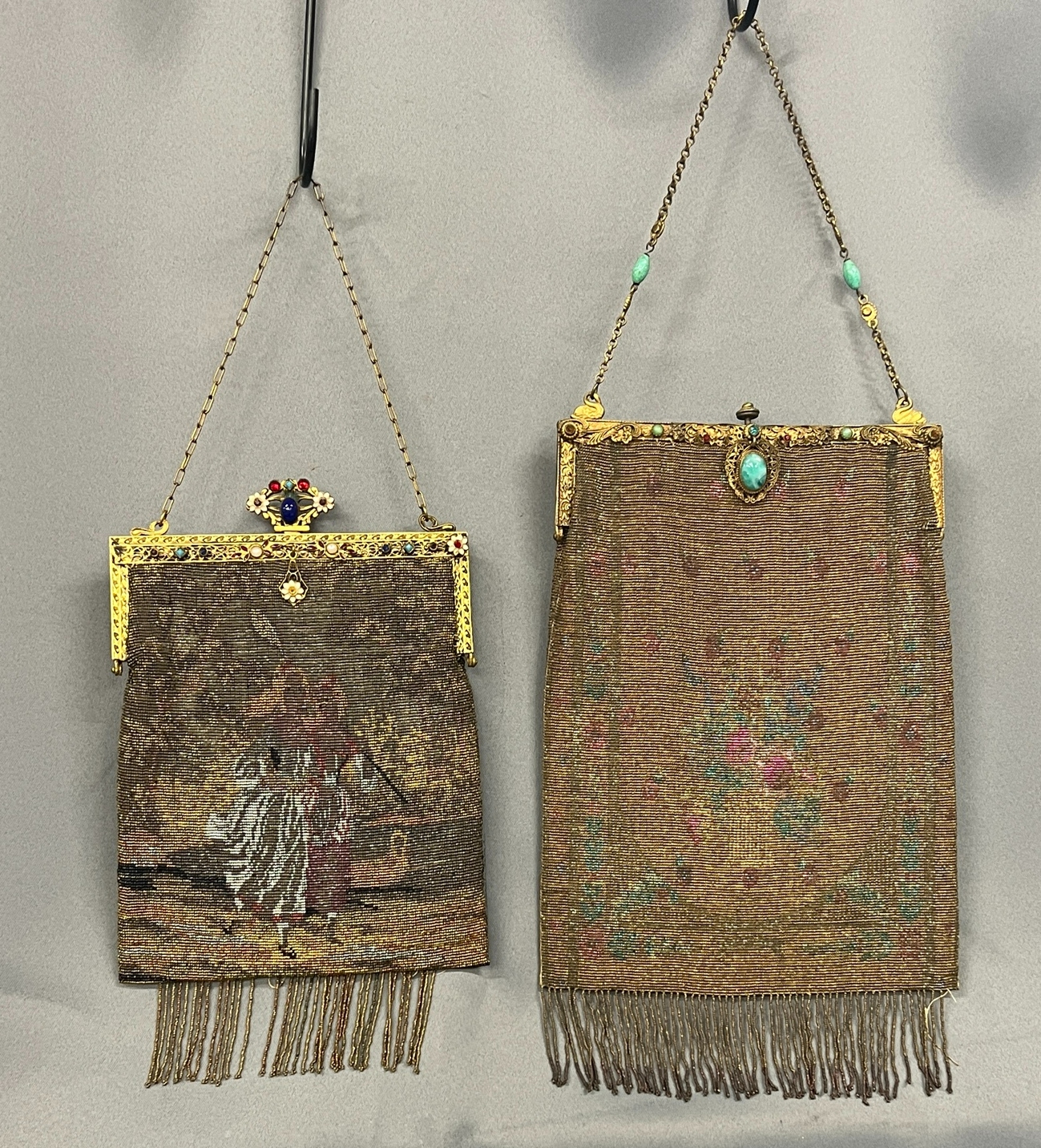 2 Early 1900's Micro Beaded Deco Flapper Purses - 8" x 21" of largest - both show wear, missing fringe, frayed lining