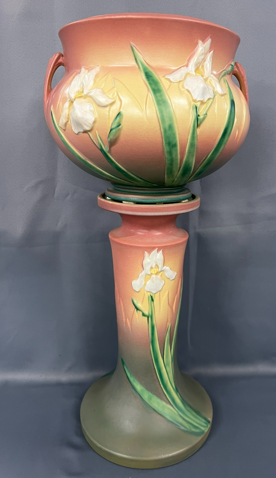 Roseville Pottery "Iris" Double Handled Jardinière and Stand - 12" x 9" x 26" T overall - 9.5" W at base