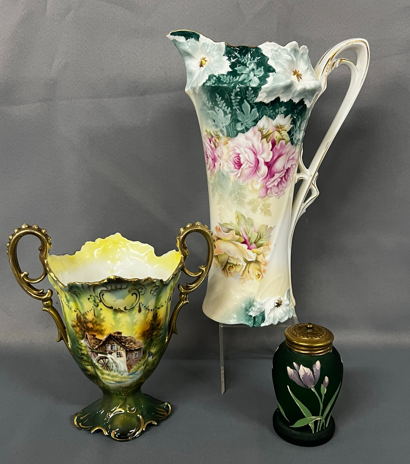 R S Prussia Porcelain Chocolate Pot, Handled Vase, Hand Painted Glass Powder Jar - 11" of tallest