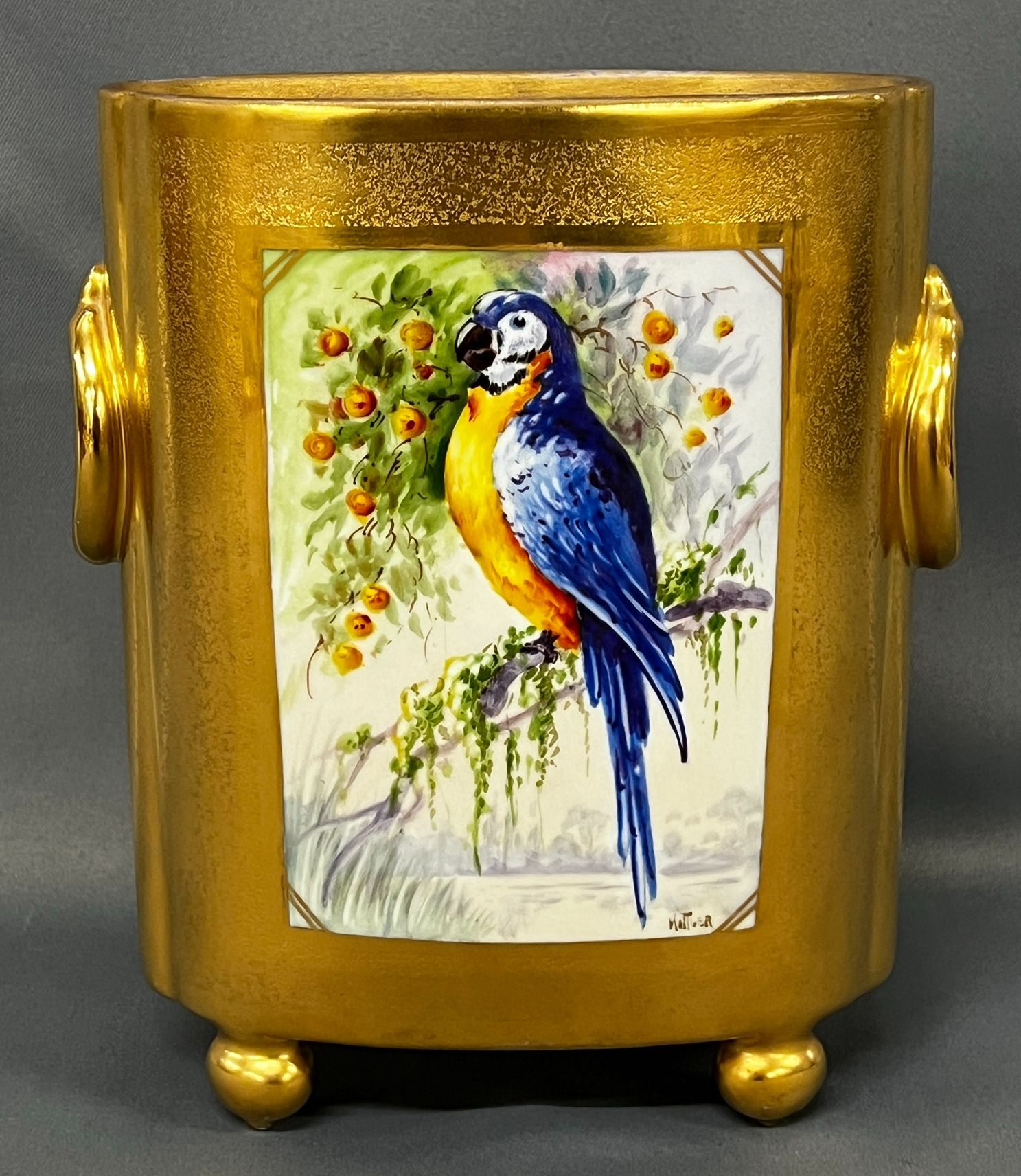 Hand Painted Gilt Accent Parrot Motif Porcelain Waste Can - 7" x 8"