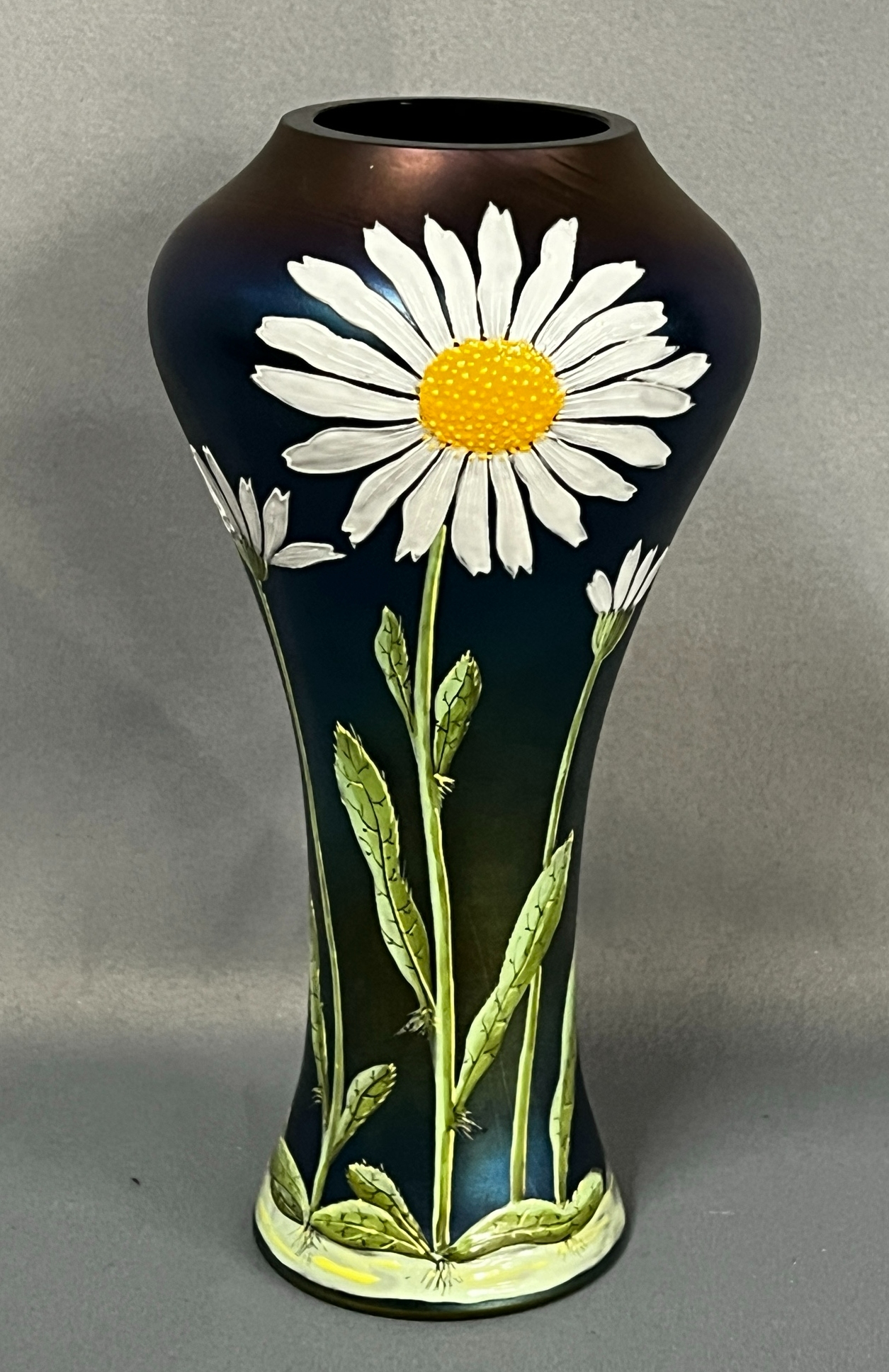 Art Nouveau Hand Painted Iridescent Daisy Motif Glass Vase - 8.5"