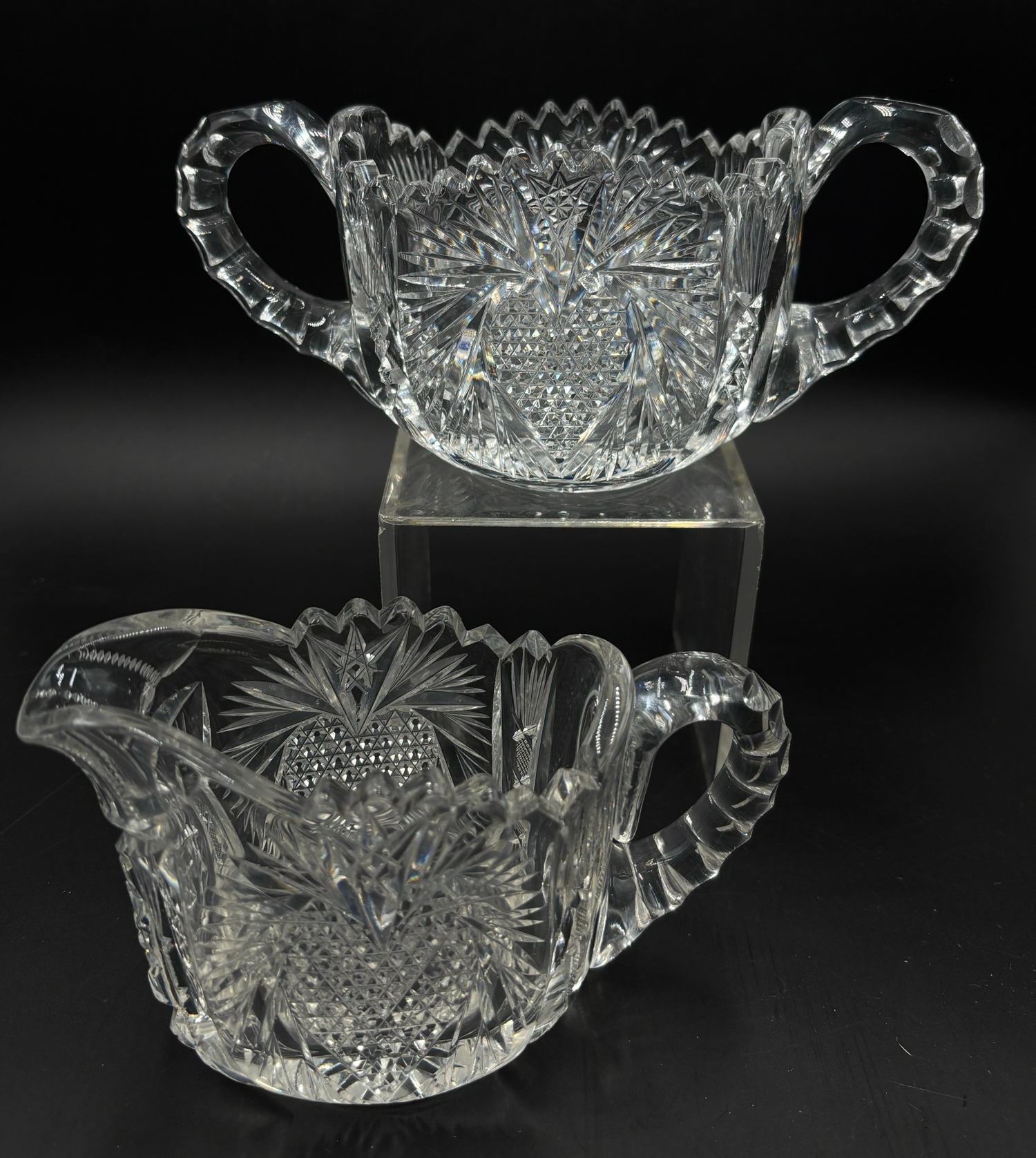 Fry American Brilliant Period Heart Pattern Cut Glass Cream and Sugar - 7" x 3" of creamer