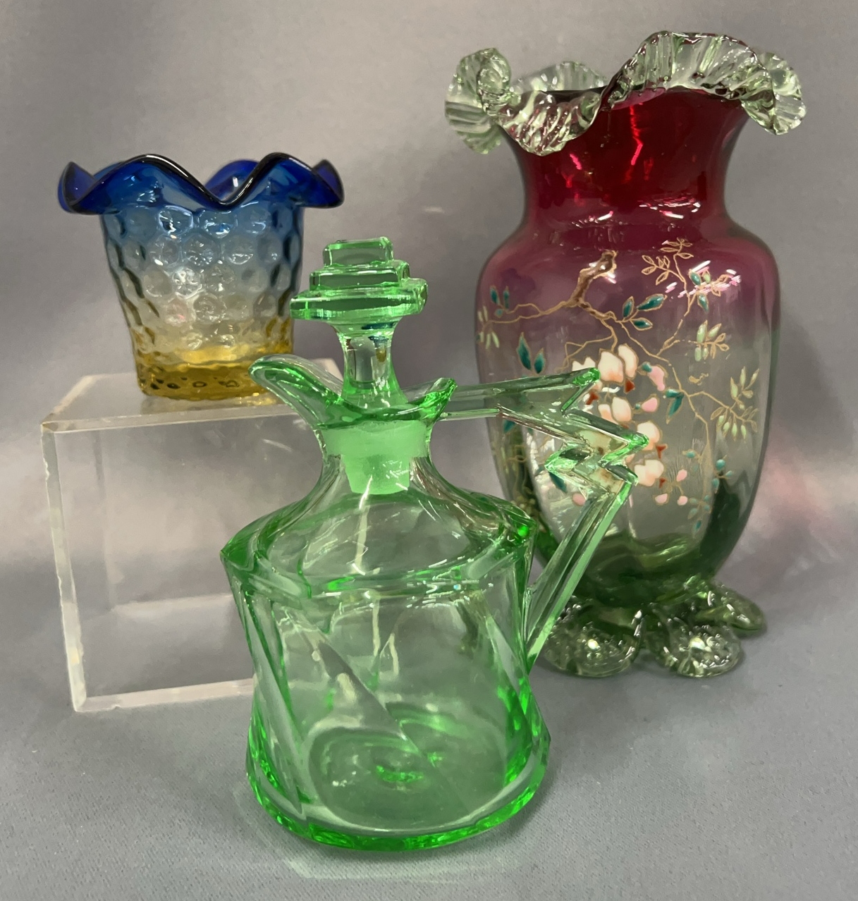 3pcs Early Glass - Cruet, Hand Painted Vase, Toothpick - 7" of tallest