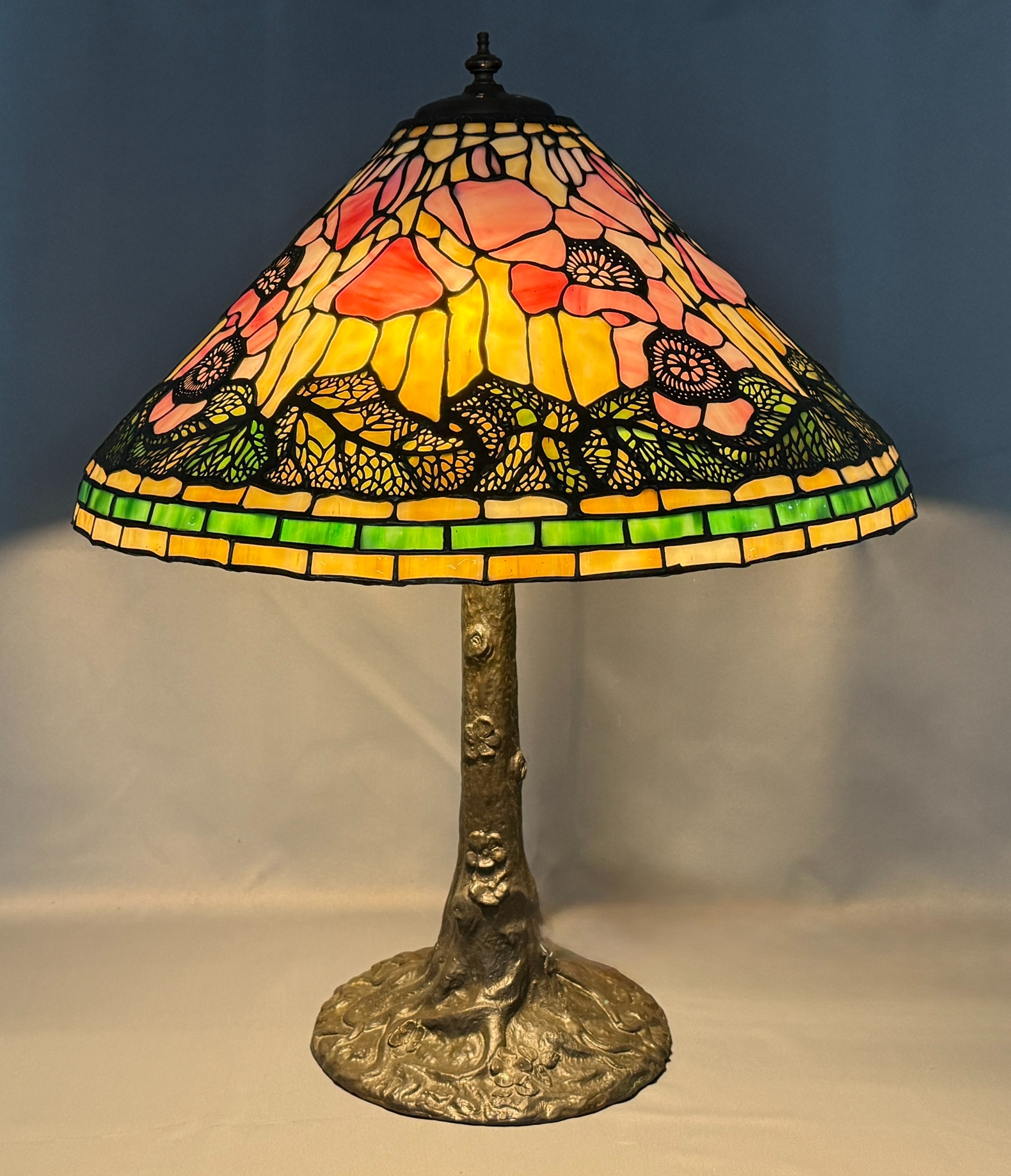Art Nouveau Bronze Faux Bois Table Lamp w/ Poppy Motif Stained Glass Shade - 26" T of lamp - 9.5" x 21" of shade - appears 2 sockets need repair