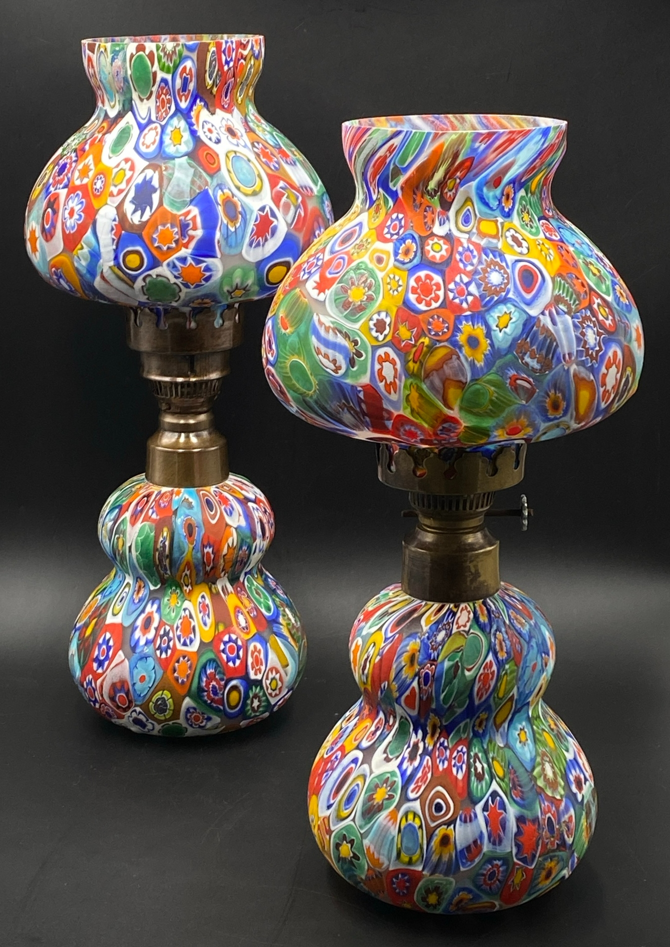 Pair Murano Millefiori Art Glass Oil Lamps - 12" of each