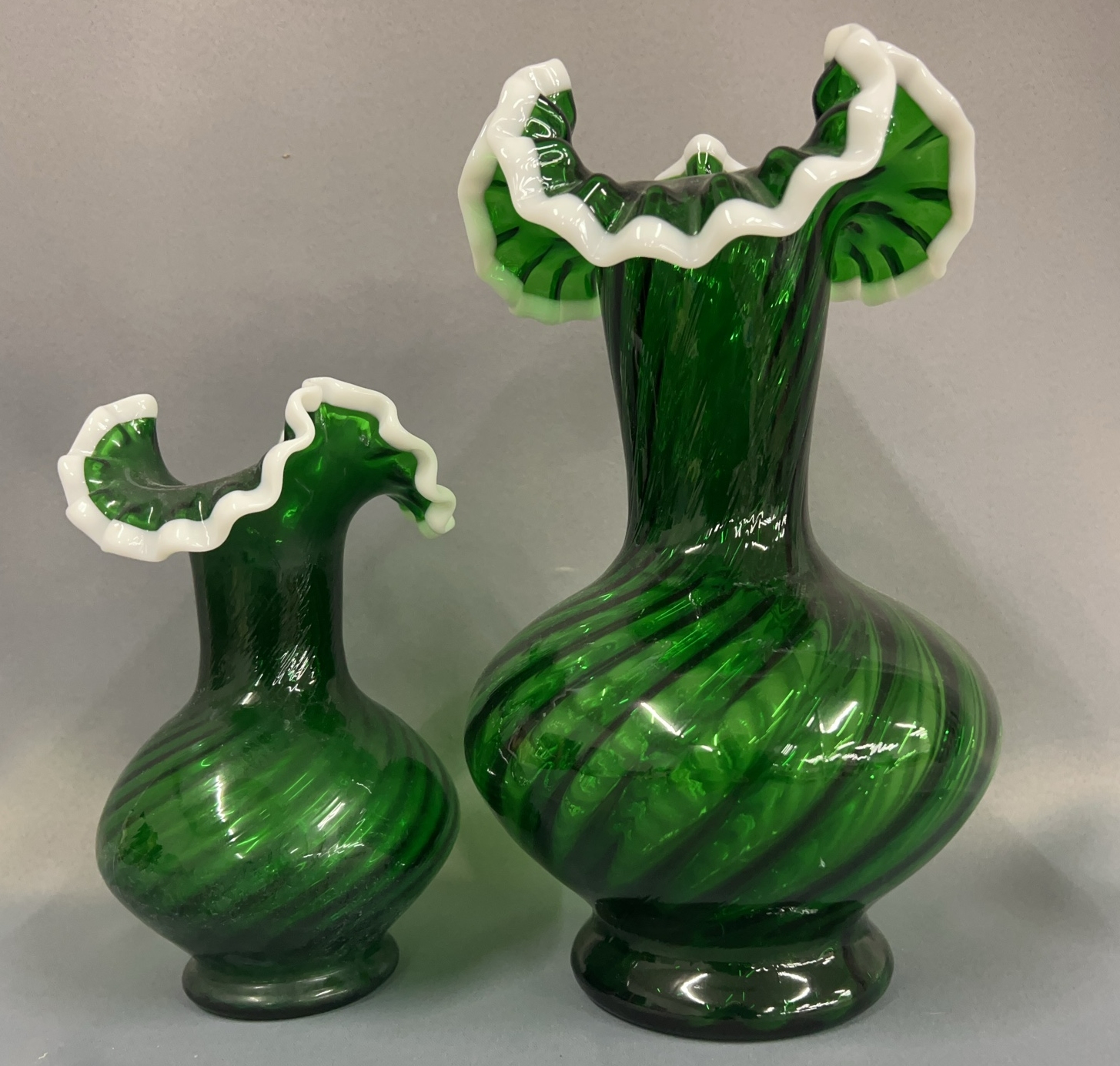 Fenton Glass Emerald Green Ruffled Snow Crest Swirl Optic Vases - 2pcs - 11" of tallest