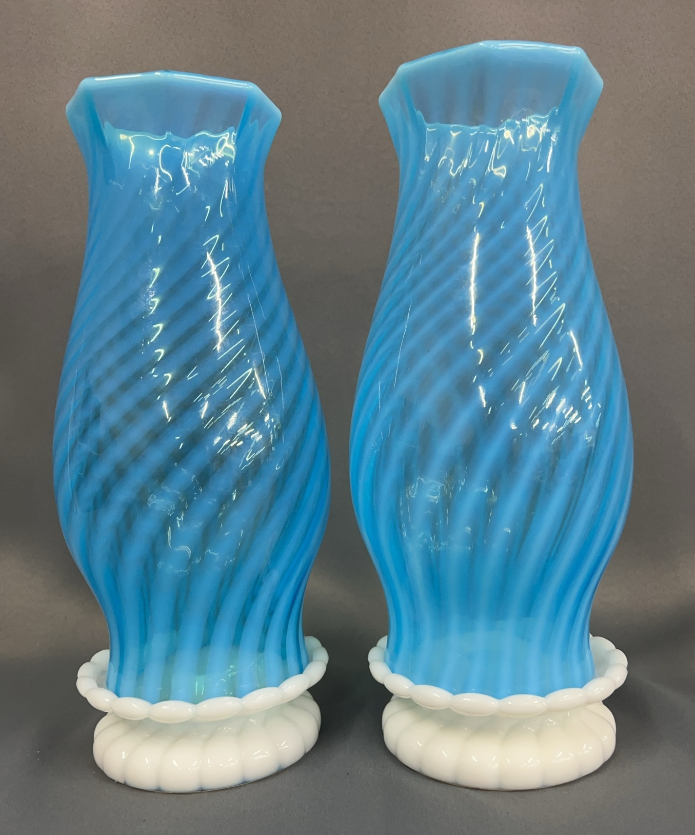 Pair Fenton Opalescent Blue Optic Swirl Candle Hurricanes - 11" of each