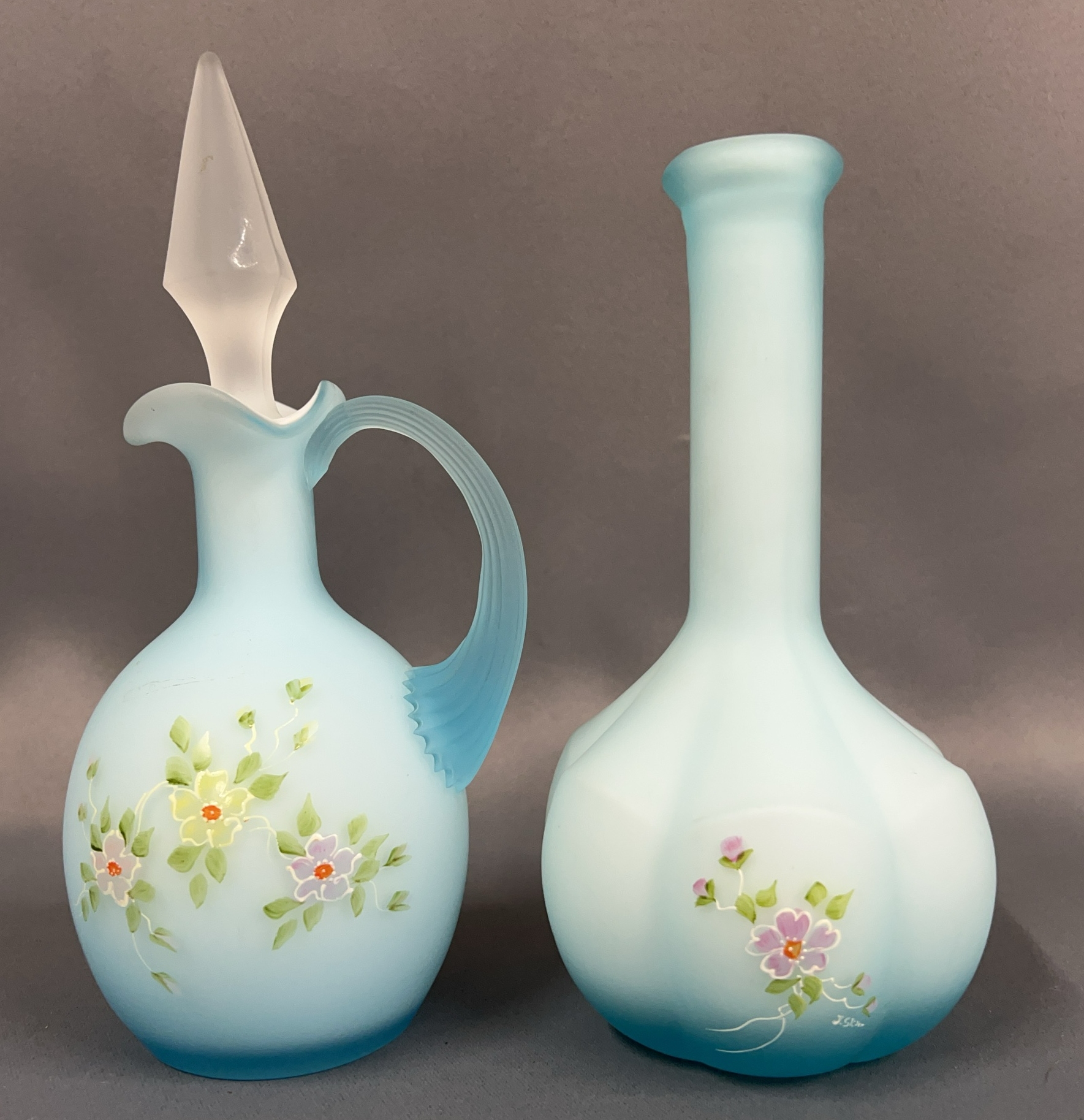 L. G. Wright Hand Painted Cased Glass Cruet and Barber Bottle - 2pcs - 7" of tallest - bottle missing stopper