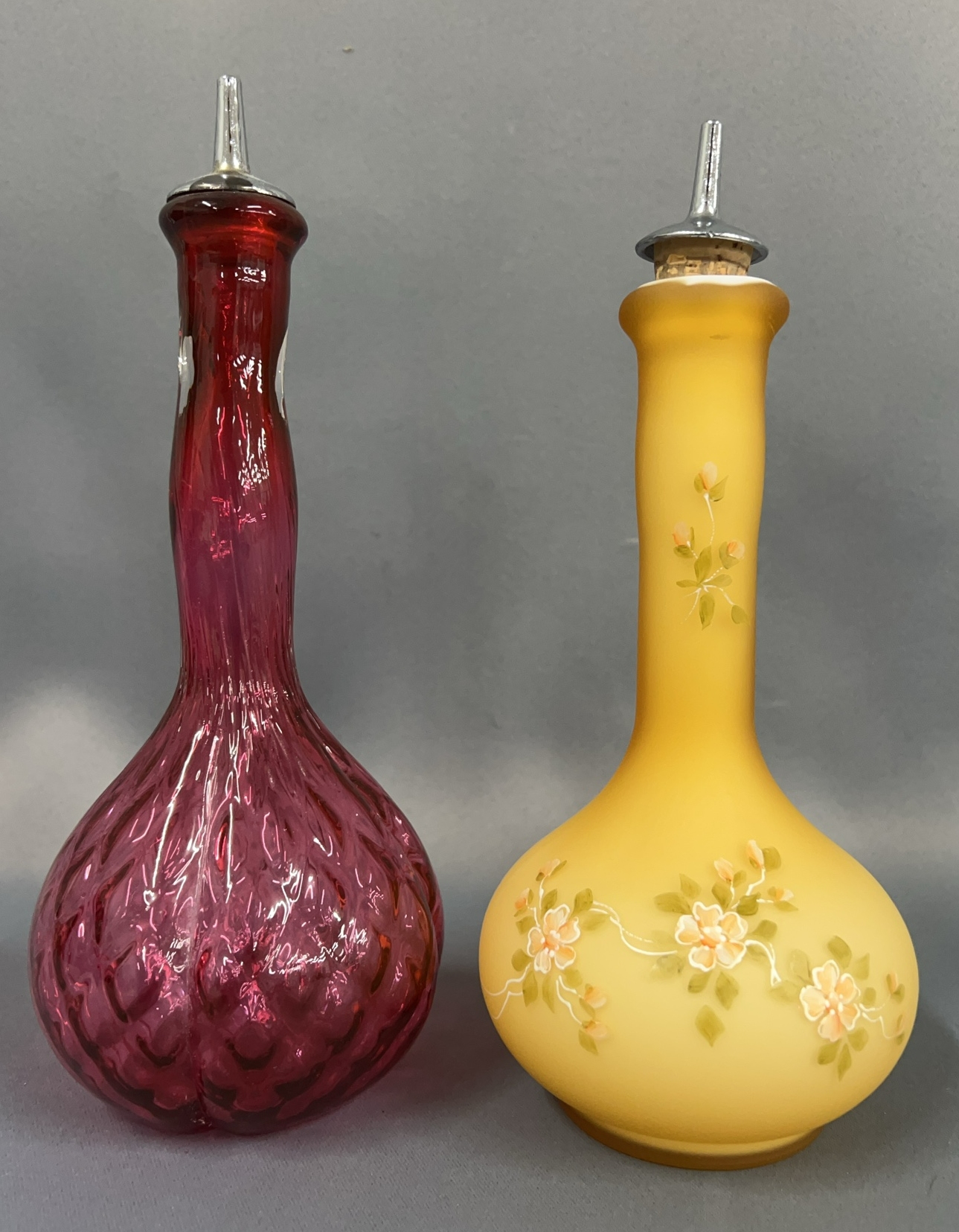 Fenton Glass Cranberry and Hand Painted Cased Glass Barber Bottles - 2pcs - 9" of tallest