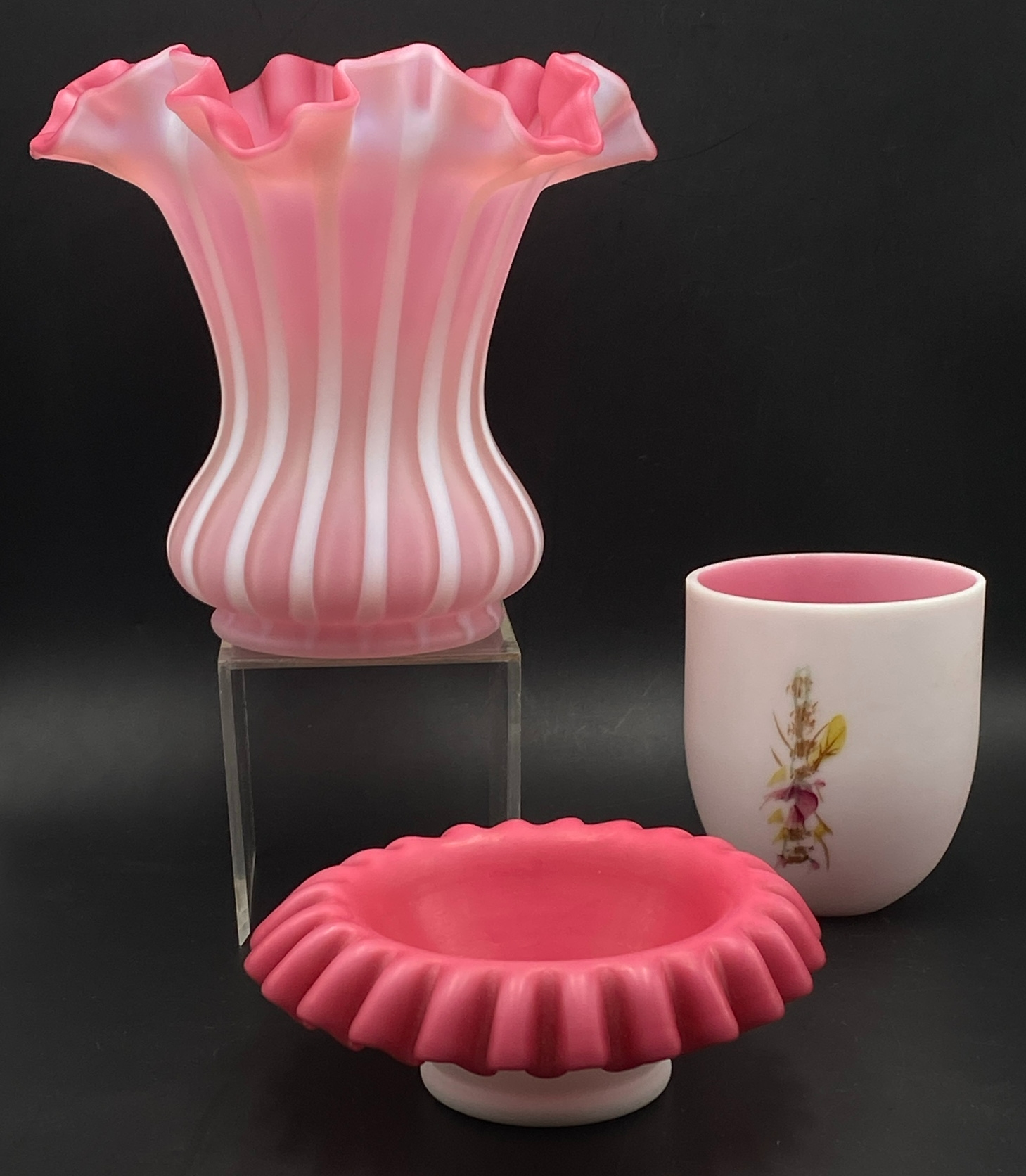 Fenton Glass Cranberry Opalescent Ruffled Edge Vase and Hand Painted Candle Votive Light - 2pcs - 6.5" of tallest