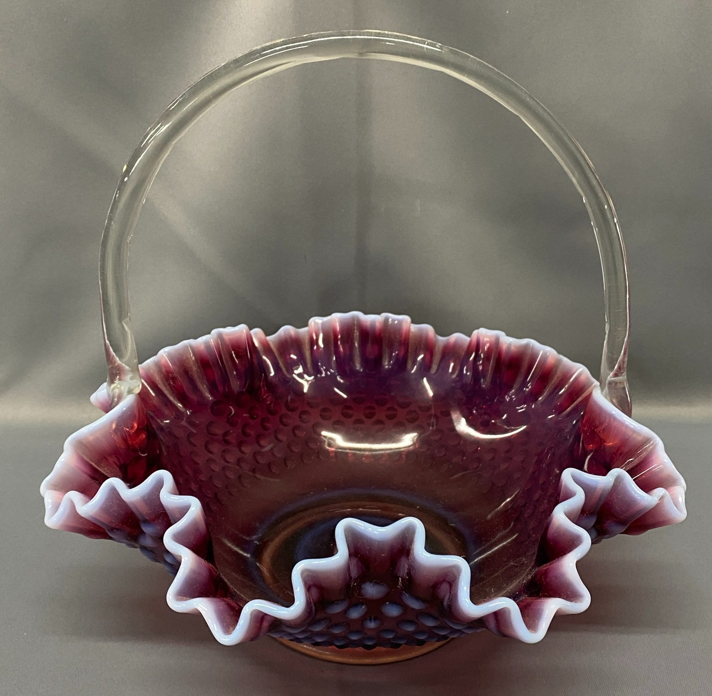 Fenton Plum Opalescent Hobnail Basket - 12" x 10"