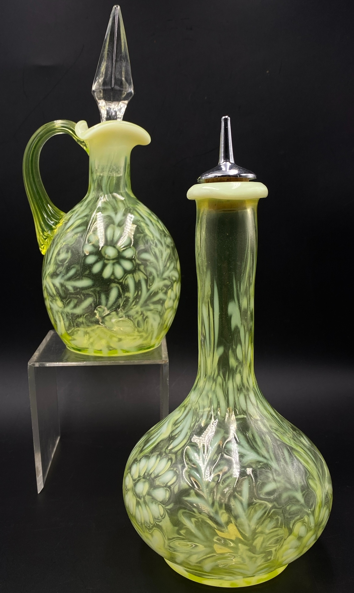 Fenton Glass UV Reactive Topaz Opalescent Daisy and Fern Cruet and Barber Bottle - 8.5" of tallest