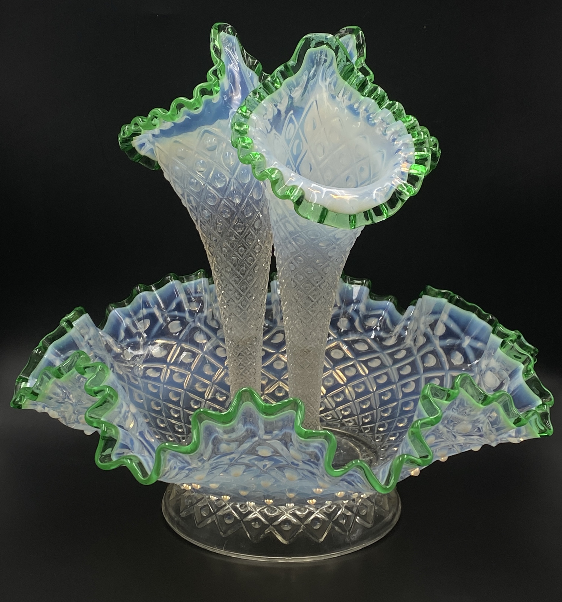Fenton Glass Diamond Lace Opalescent Green Ruffled Edge Trim Epergne - 12" x 11" - has repaired damage, see photos