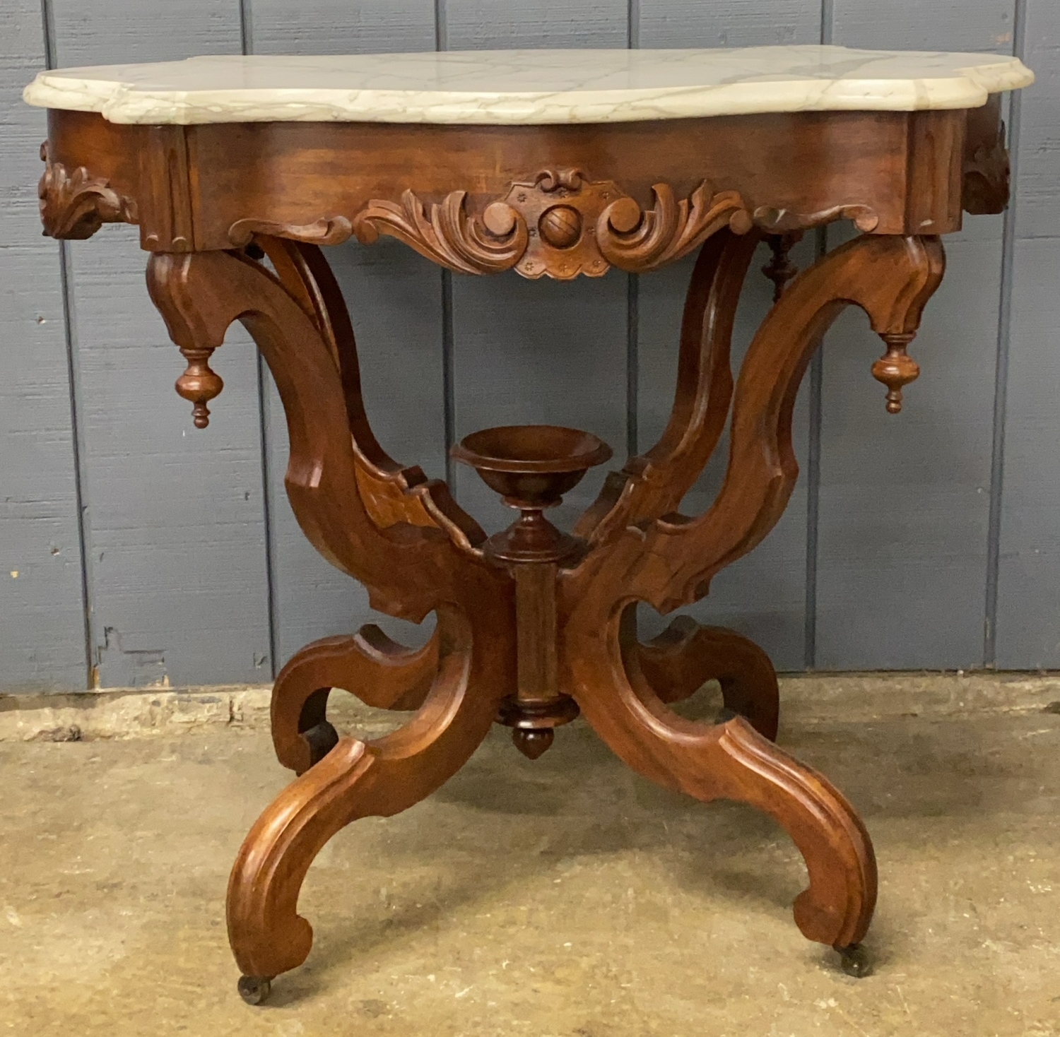 Ornate Carved Wood Turtle Marble Top Parlor Table - 33" x 25" x 30