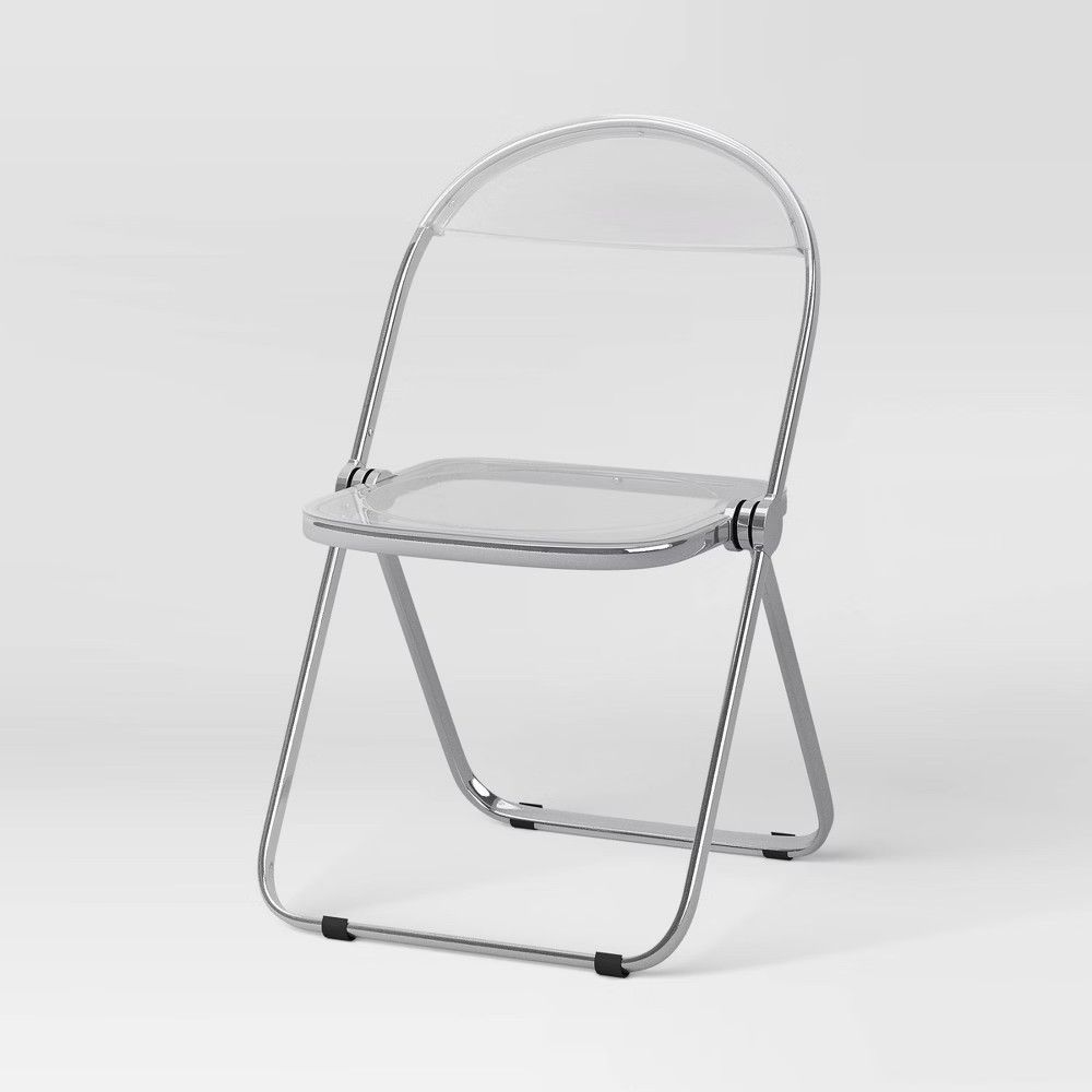 This Metal Acrylic Folding Chair from Room Essentials? makes a versatile addition to your seating. This armless chair has a metal frame and a clear acrylic seat and upper back support for a modern aesthetic. The foldable design ensures easy storage, making it ideal for any event. Pull up the chair for a card game or for extra seating around the dining table. Room Essentials?: Everyday Value.