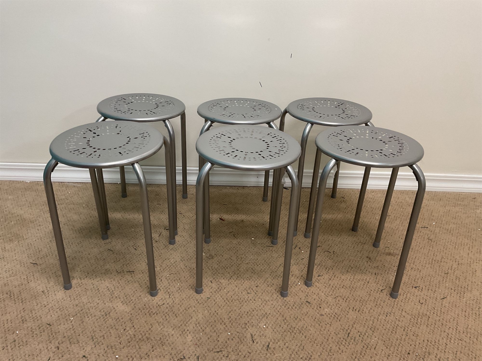This set of six metal silver stools features a sleek and modern design perfect for both indoor and outdoor use. Each stool is crafted with a durable metal frame, ensuring stability and strength. The round seats have a unique perforated pattern that adds a stylish touch while providing comfort. Lightweight and easily stackable, these stools are great for adding extra seating to gatherings or for use in kitchen, dining, or patio areas. Their versatile design allows them to complement various decor styles effortlessly. Ideal for any space in need of functional seating.