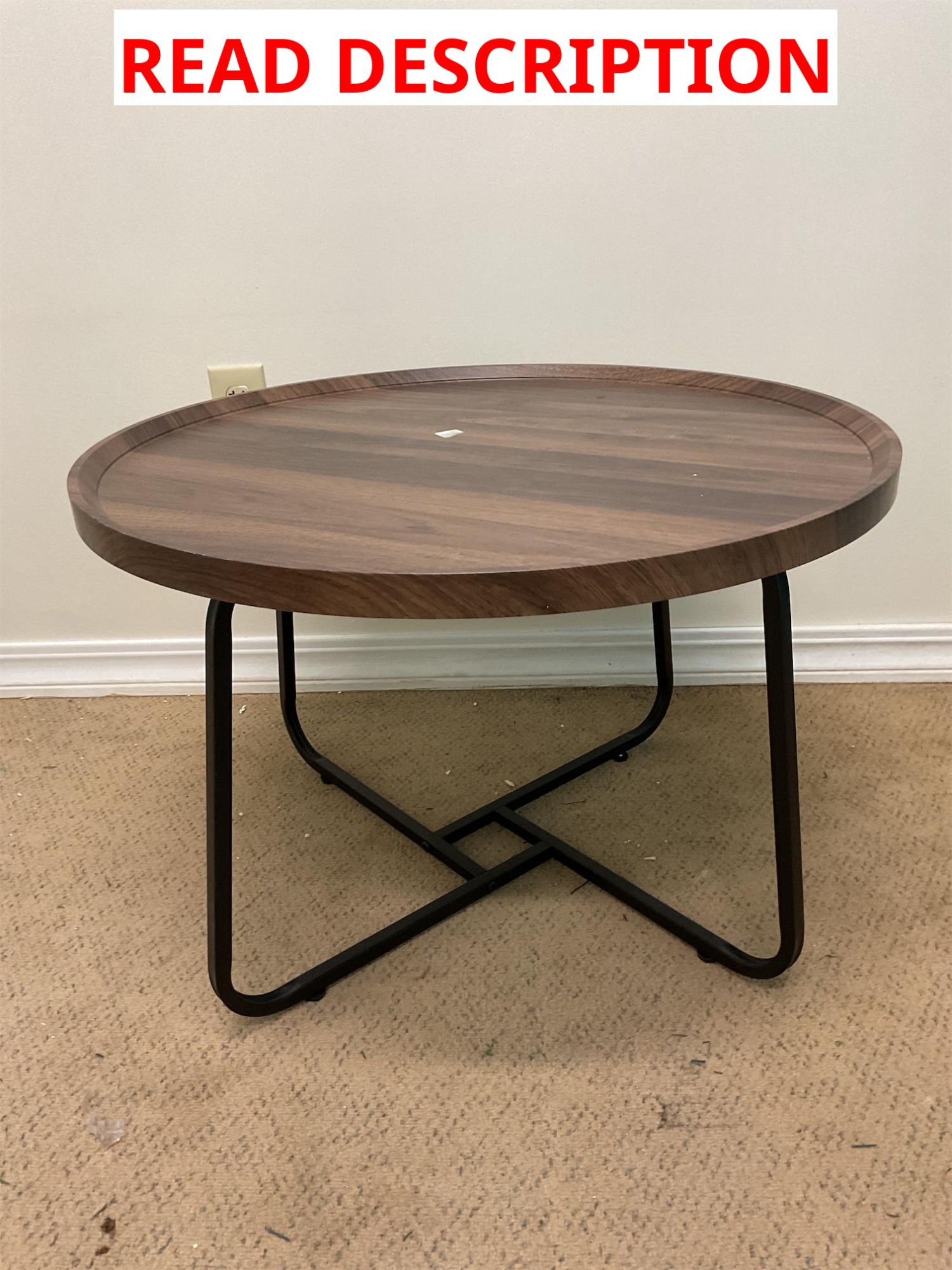 This charming little wooden coffee table features a round top crafted from rich wood, showcasing a beautiful grain pattern. The tabletop has a subtle raised rim, adding both style and functionality. It is supported by a sleek, black metal frame that provides stability while enhancing its modern aesthetic. Perfect for small spaces, this table can serve as a cozy spot for your coffee or books, blending seamlessly with various decor styles.