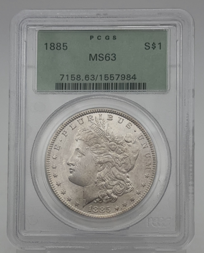 This listing features a 1885 Morgan Silver Dollar graded MS63 by PCGS.