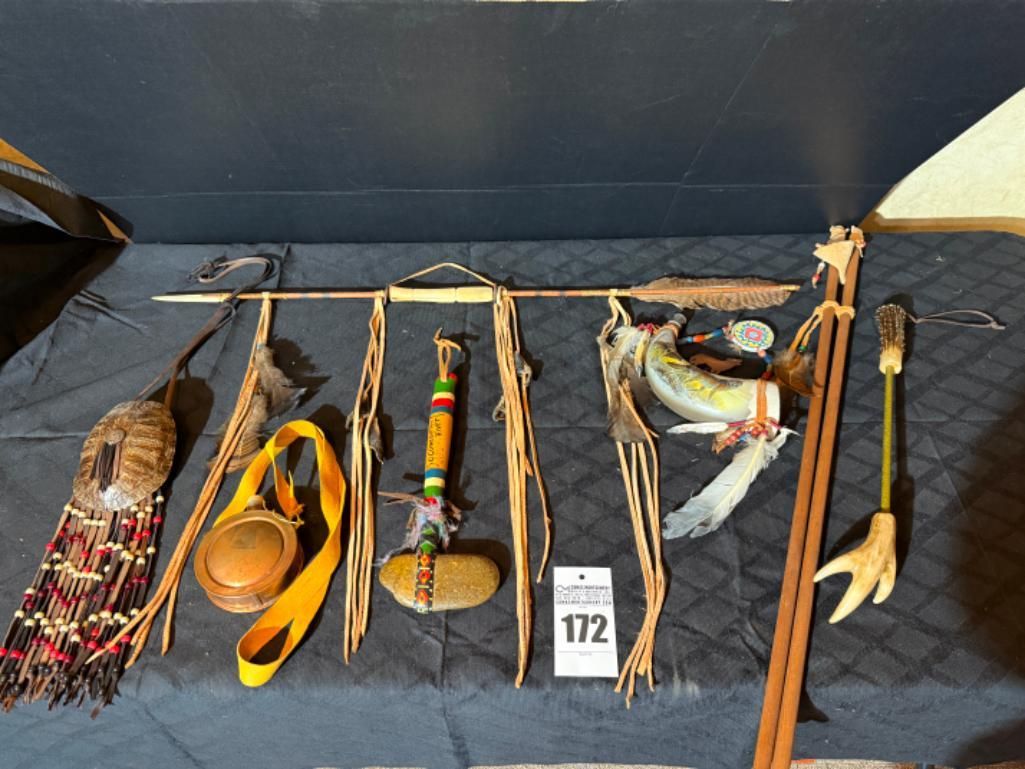 Lot includes cooper canteen, stone hatchet, tortoise shell bag.