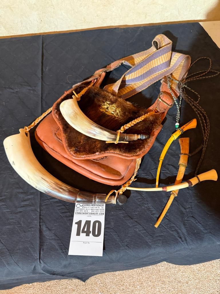 Crafted of leather with two attached gun powder horns. One with eagle craving.