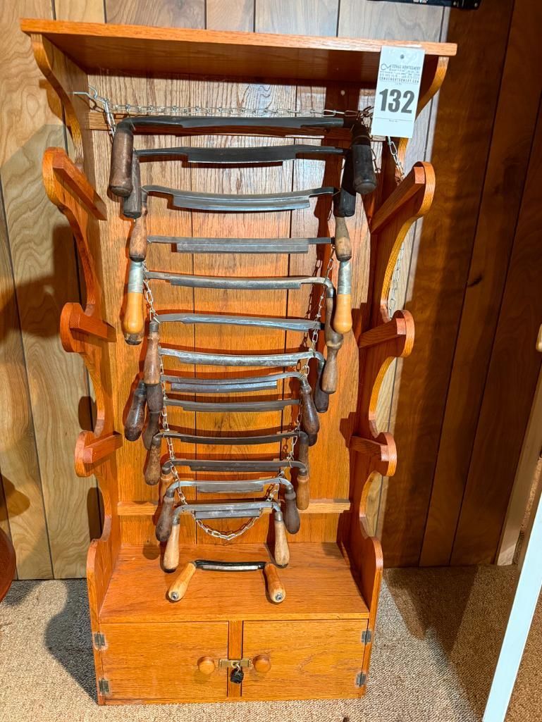 Collection of draw knives ranging in blade length from 5 inches to 11 inches. Wooden display case with storage at the bottom.