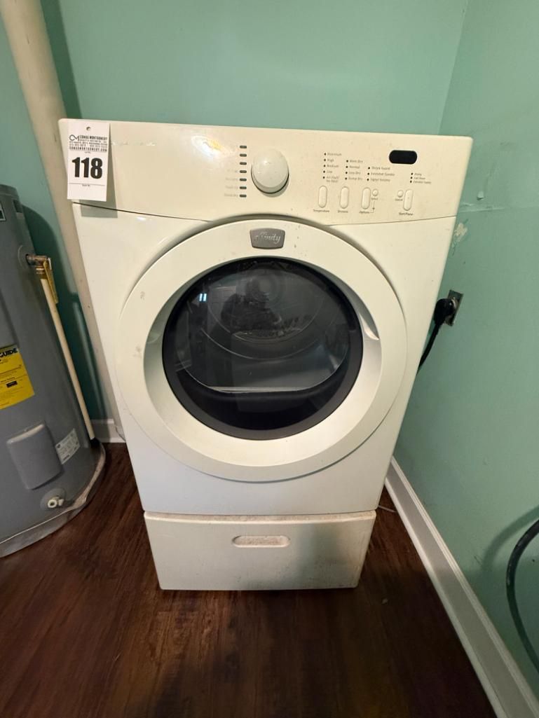 Frigidaire Affinity dryer on pedestal. 5.8 cu ft with 7 cycles and 5 temps.