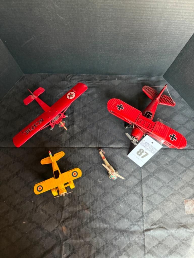 Lot contains one vintage tin toy helicopter, two miniature collectible bi planes and one ERTL Wings Of Texaco 1929 Curtis's Robin metal die cast coin bank Airplane NC 373 E #6 in series.