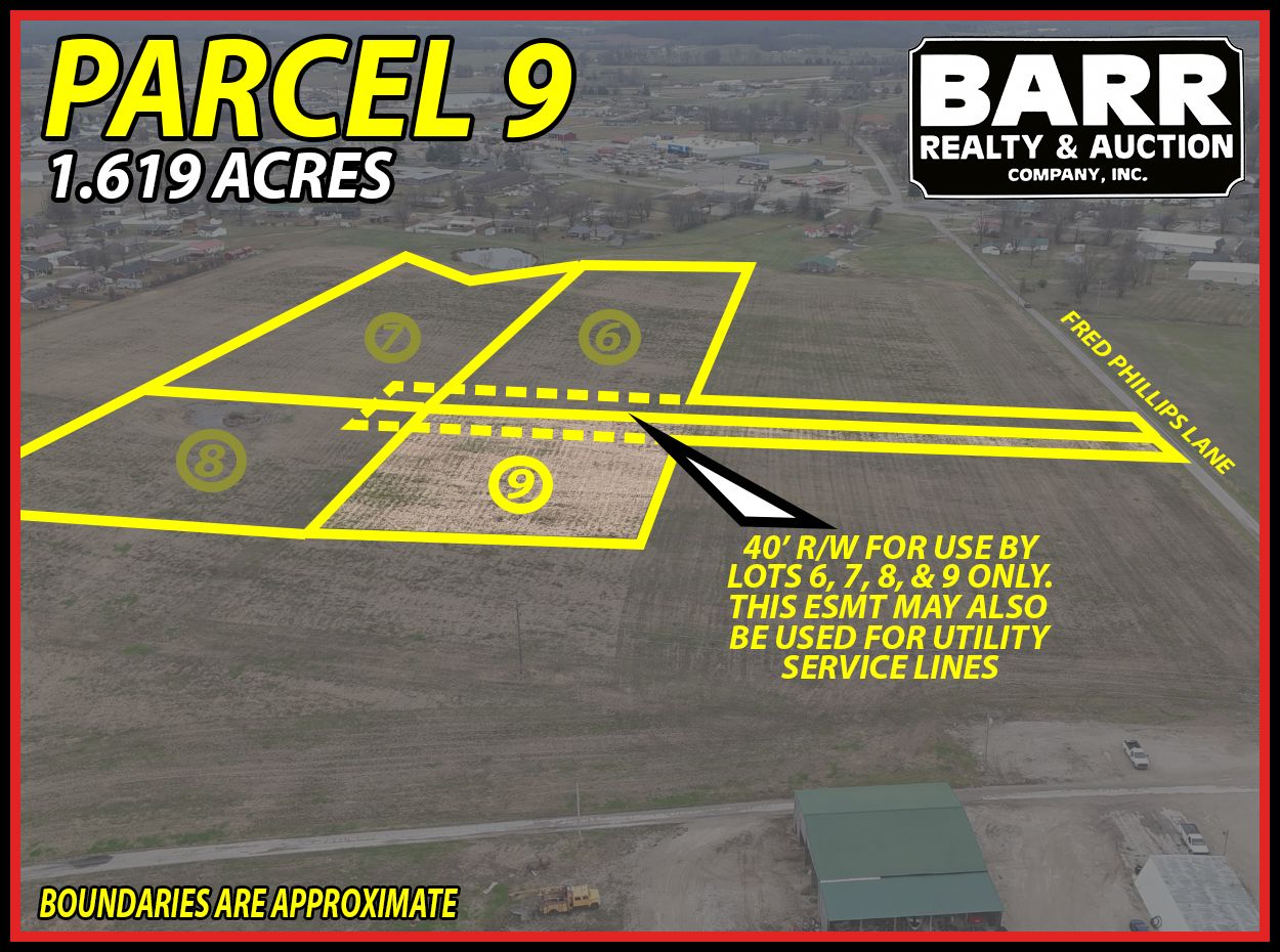 Parcel 9: 1.619 acres; Notice to bidders: Parcels 1, 2, 3, 4, 5, 6, 7, 9, 10, 11, 12, 13, 23 and 24 are located in the city limits of Hardinsburg, KY and are zoned R1-Residential. Said parcels will be subject to the City of Hardinsburg Planning and Zoning rules and regulations. All Parcels 1 through 24 are available to HMU water, Meade County RECC electrical service, and natural gas at buyer’s expense.