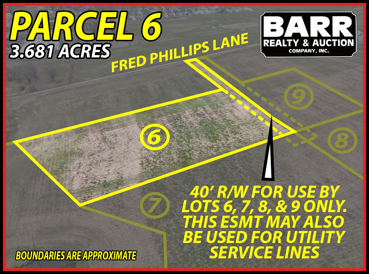 Parcel 6: 3.681 acres; Notice to bidders: Parcels 1, 2, 3, 4, 5, 6, 7, 9, 10, 11, 12, 13, 23 and 24 are located in the city limits of Hardinsburg, KY and are zoned R1-Residential. Said parcels will be subject to the City of Hardinsburg Planning and Zoning rules and regulations. All Parcels 1 through 24 are available to HMU water, Meade County RECC electrical service, and natural gas at buyer’s expense.