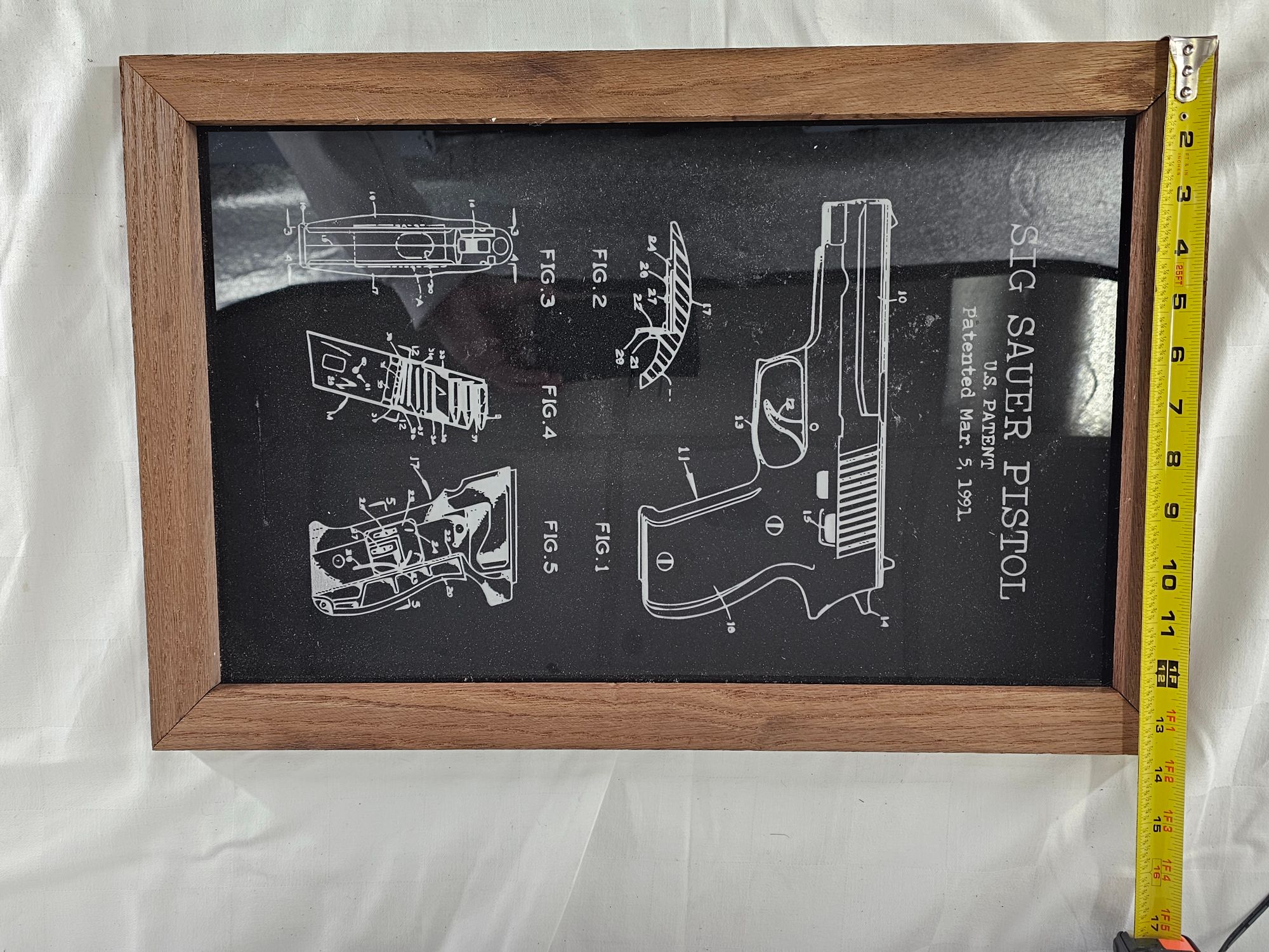 3X PISTOL PATENT BLUEPRINT WALL DECORATION, WOOD FRAMED, SIG SAUER, GLOCK, J.M. BROWNING